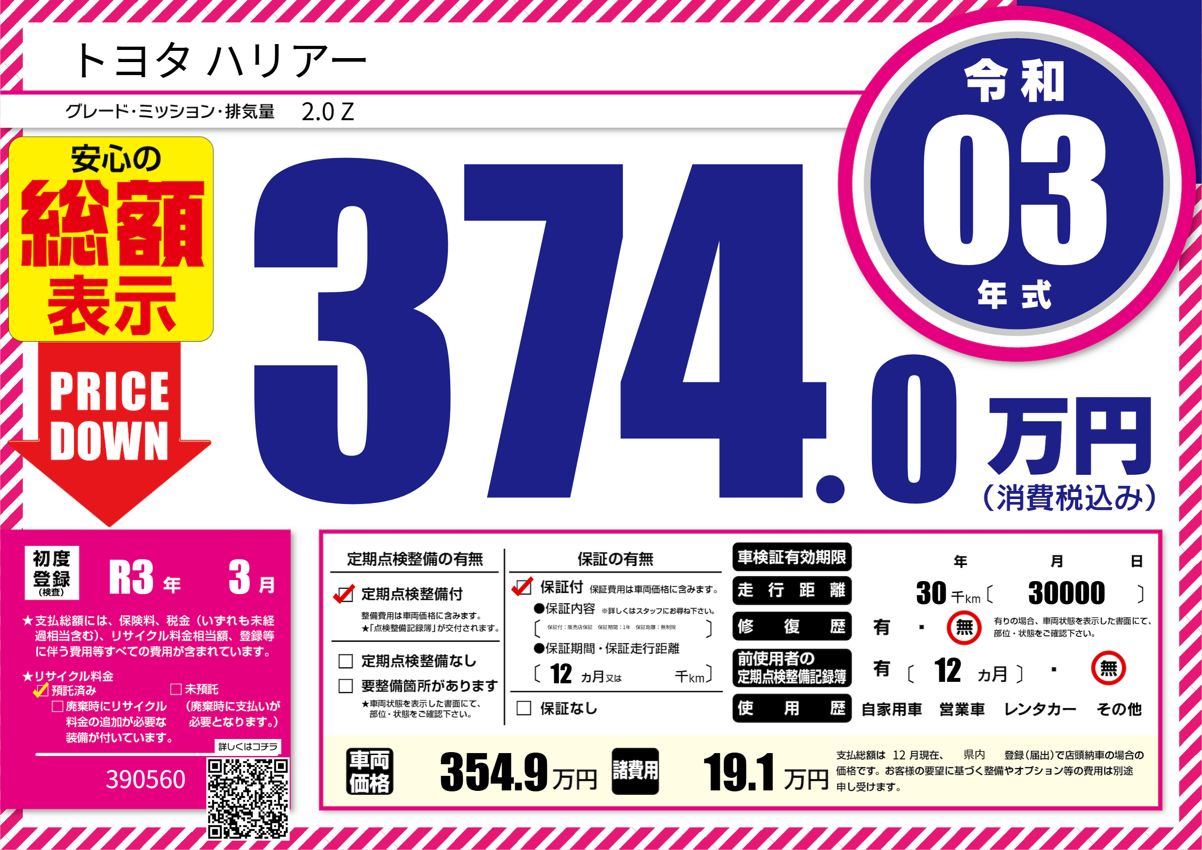 | 走行キロ | 3万km | 初年度登録 | R3年3月 |