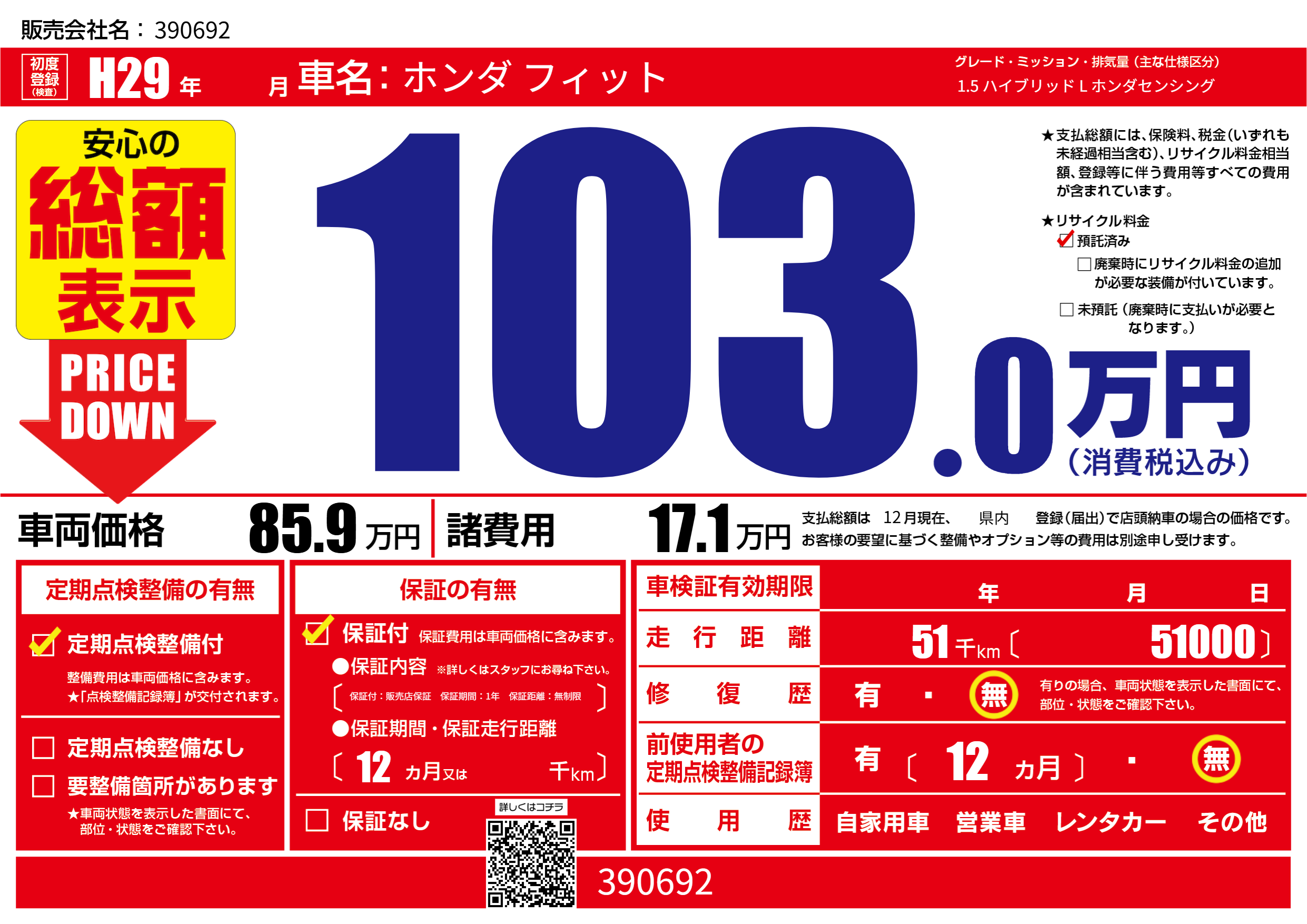 あり | リサイクル預託金相当額 | ( 0円)が別途必要 |