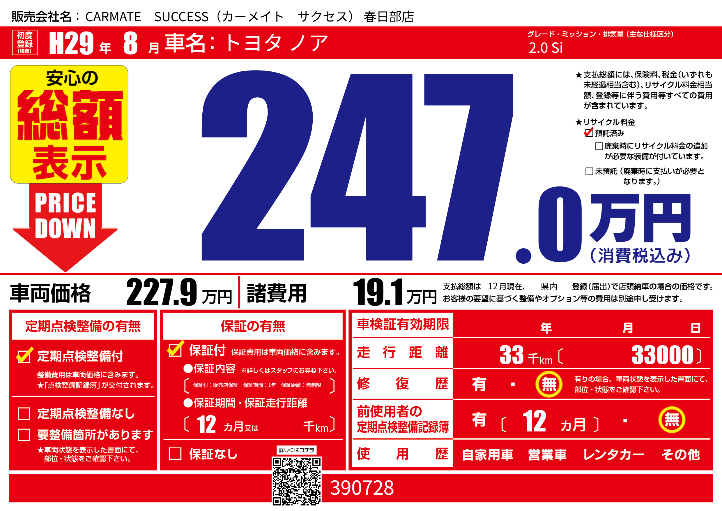 | 走行キロ | 3.3万km | 初年度登録 | H29年8月 |