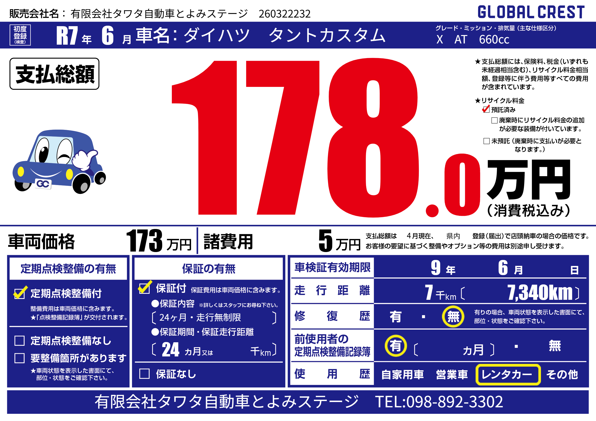 | 走行キロ | 0.7万km | 初年度登録 | R7年6月 |