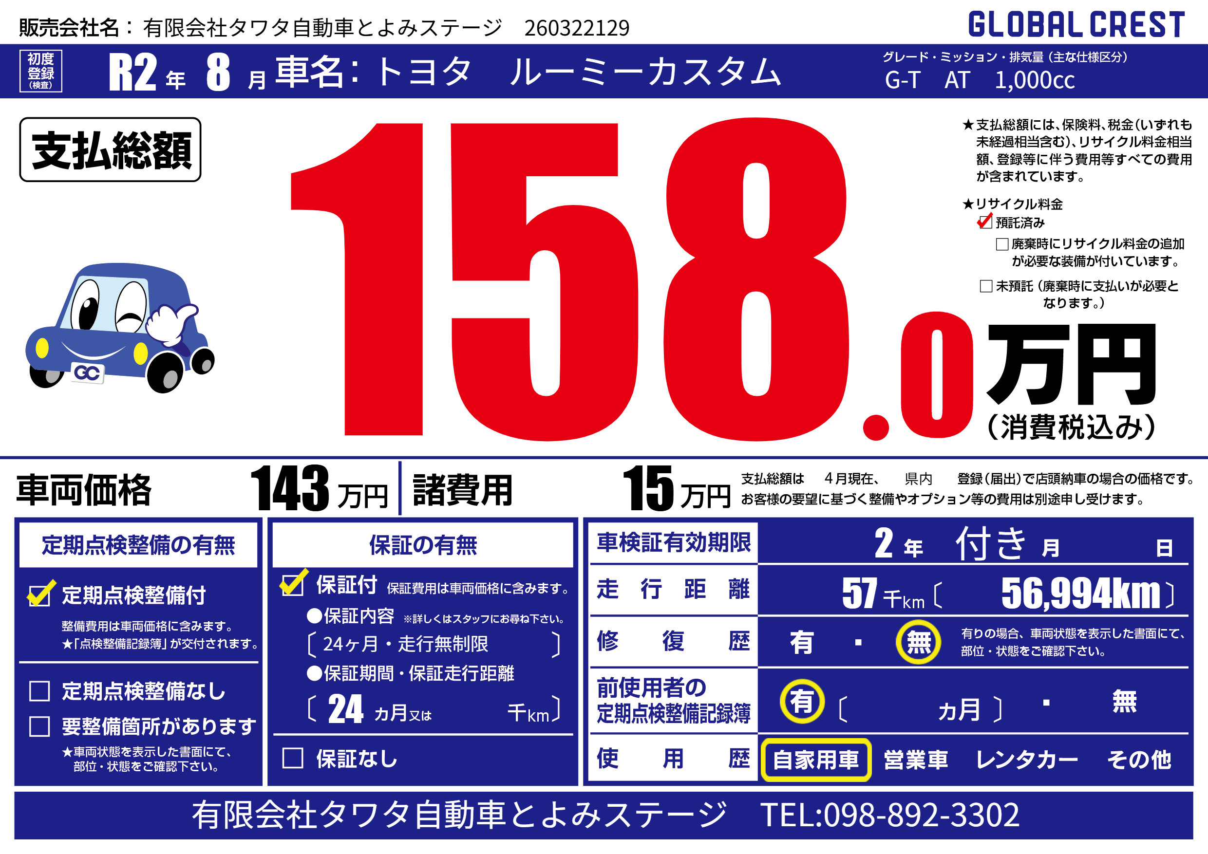 | 車名 | トヨタ ルーミーカスタム | グレード ミッション 排気量 |
