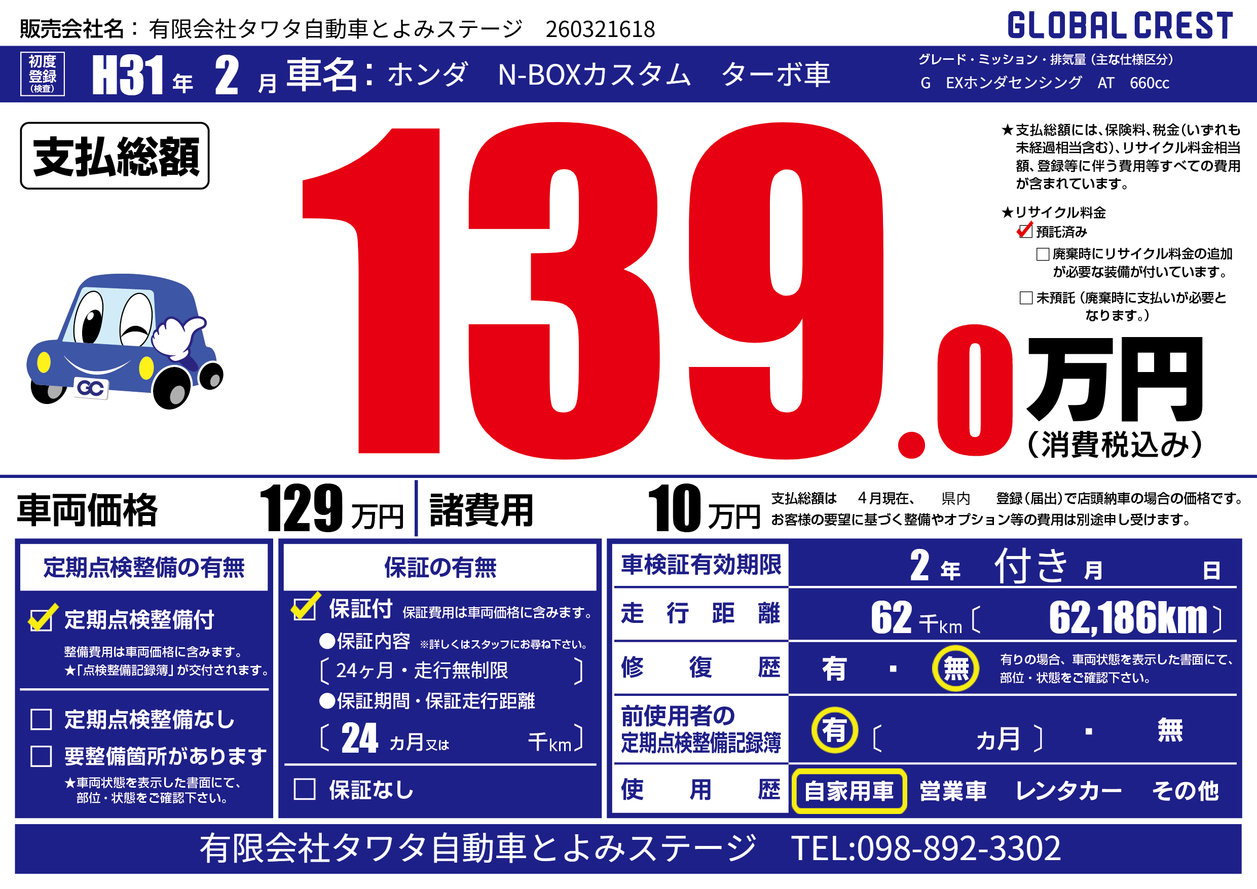 | 走行キロ | 6.2万km | 初年度登録 | H31年2月 |