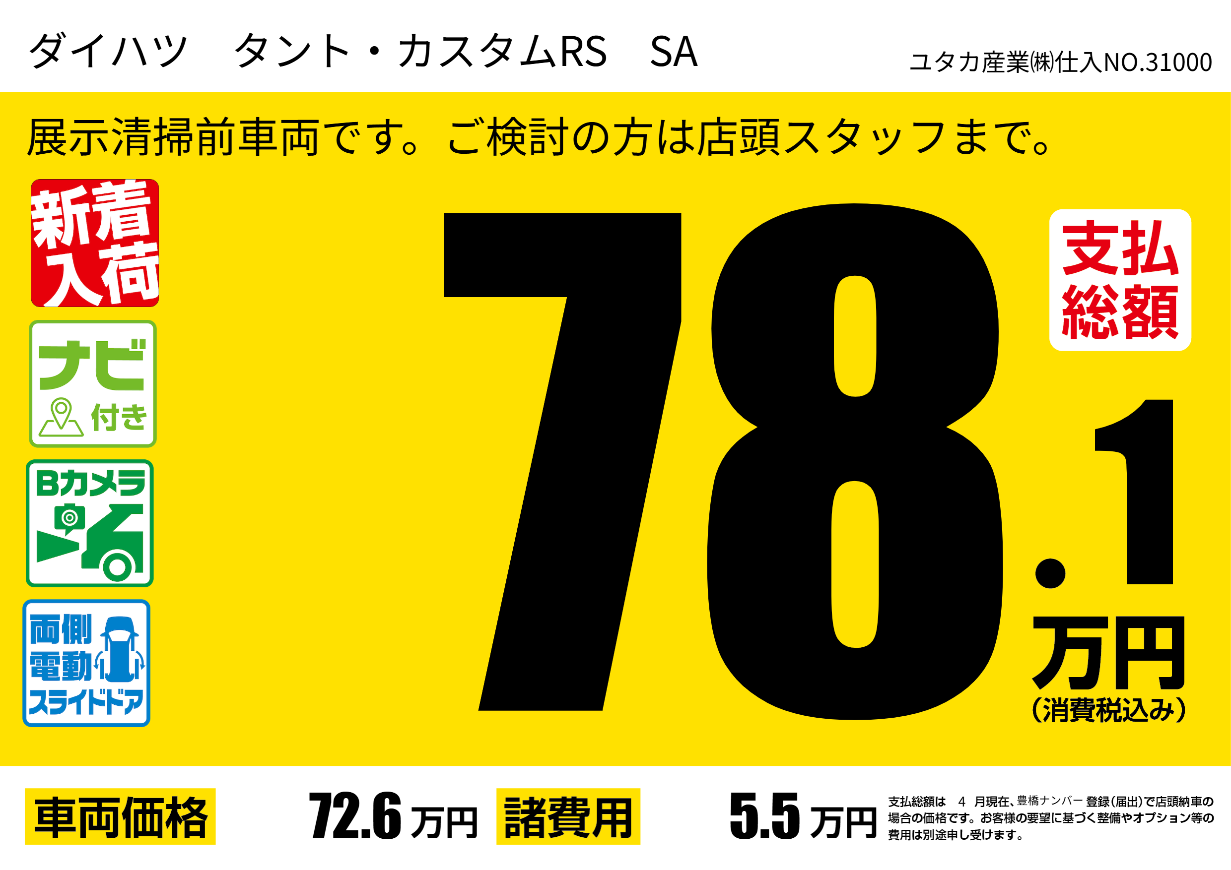 | 車名 | ダイハツ タント・カスタムRS SA | グレード ミッション 排気量 |