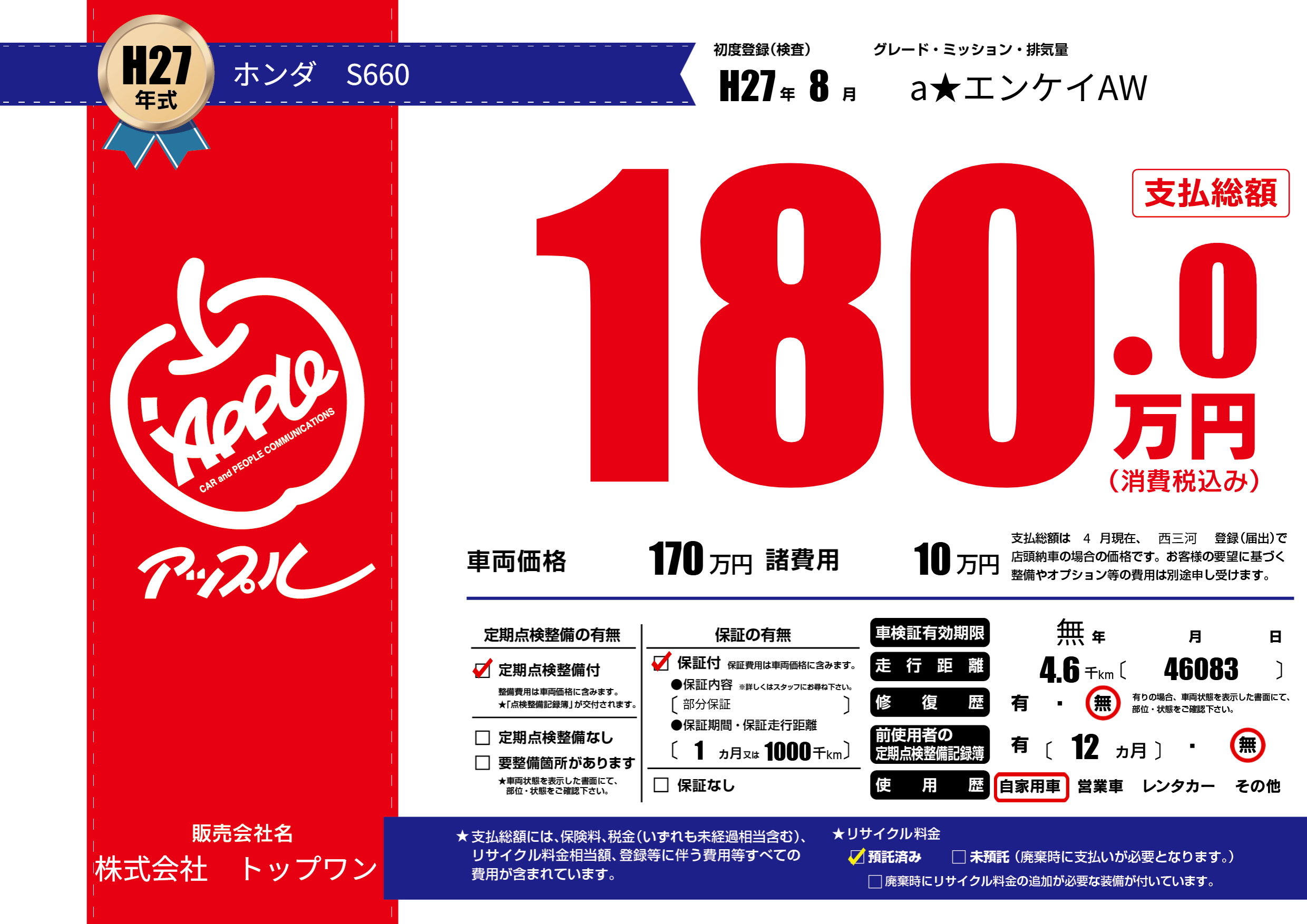 | 車名 | ホンダ S660 | グレード ミッション 排気量 |