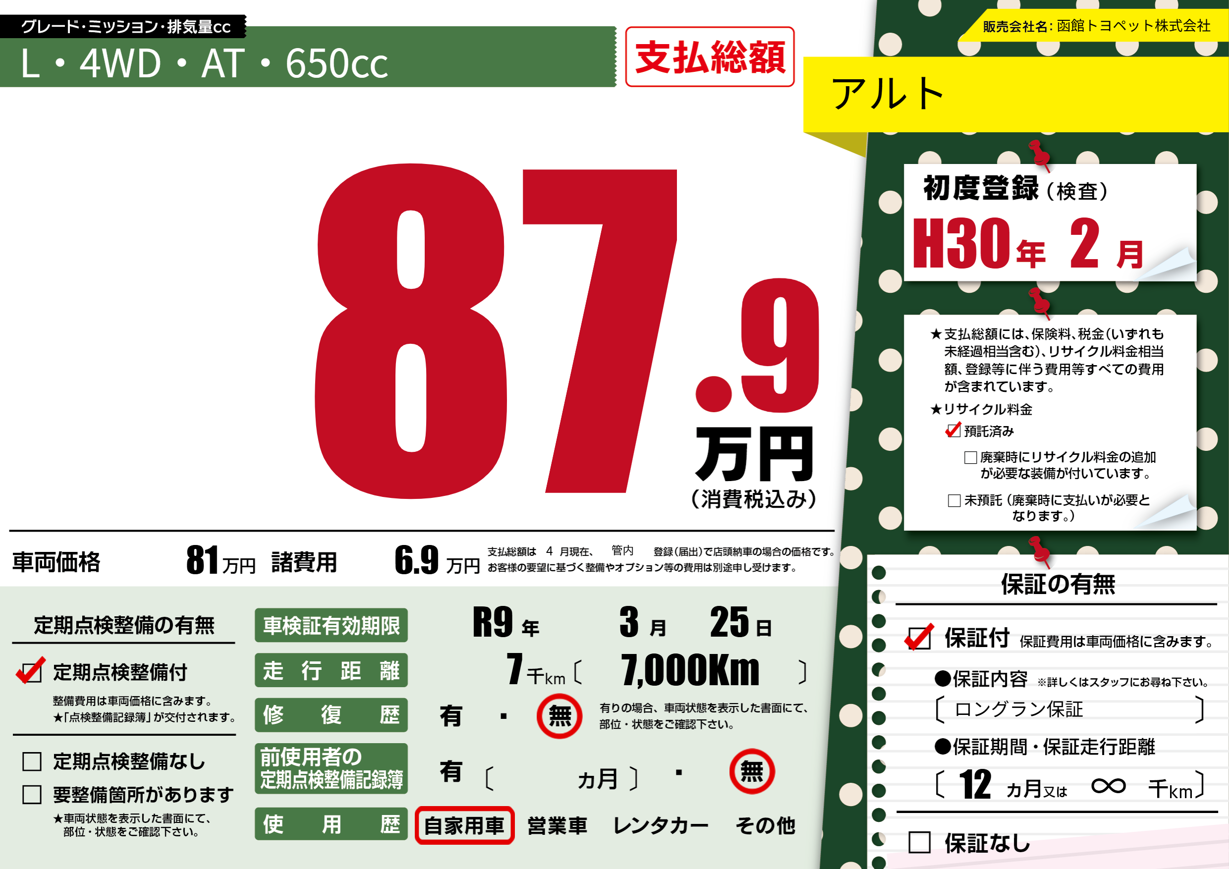 なし | 車検制限 | R9年3月25月 |