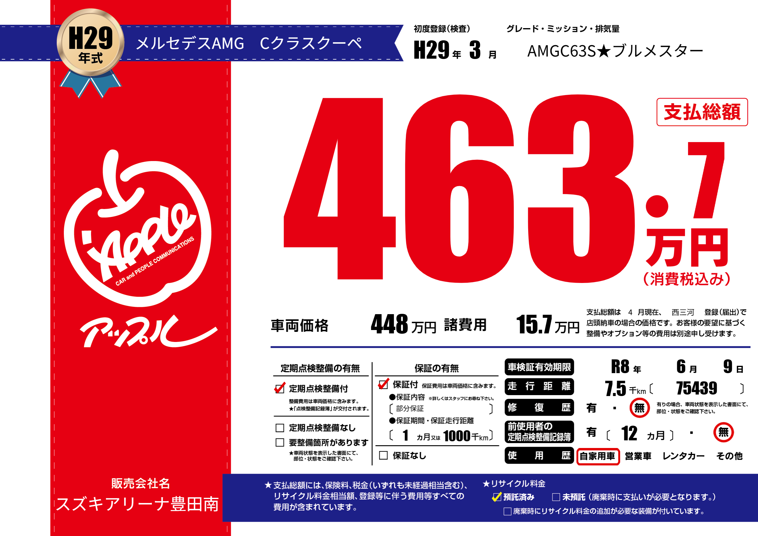 | 車名 | メルセデスAMG Cクラスクーペ | グレード ミッション 排気量 |