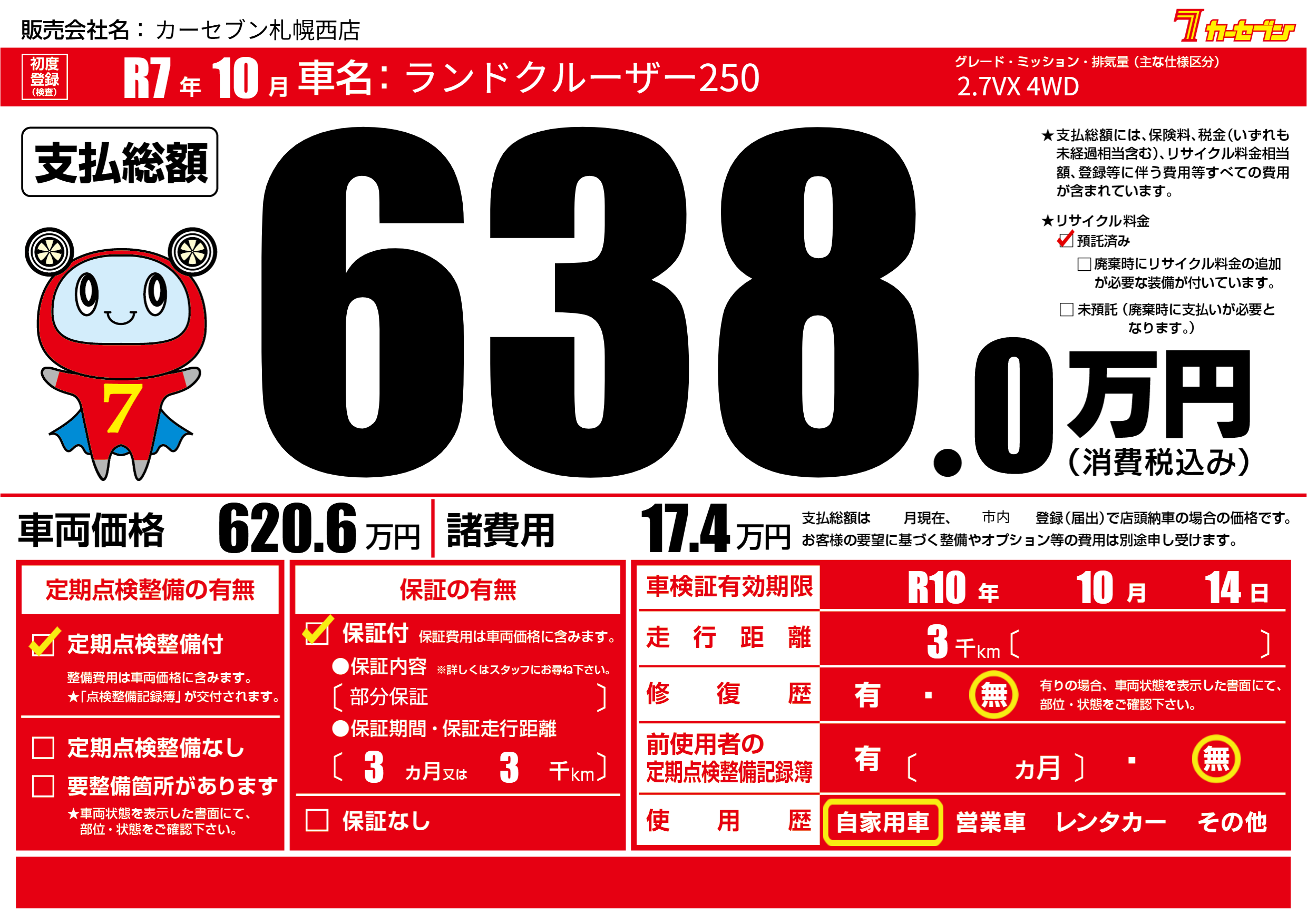 | 走行キロ | 0.3万km | 初年度登録 | R7年10月 |