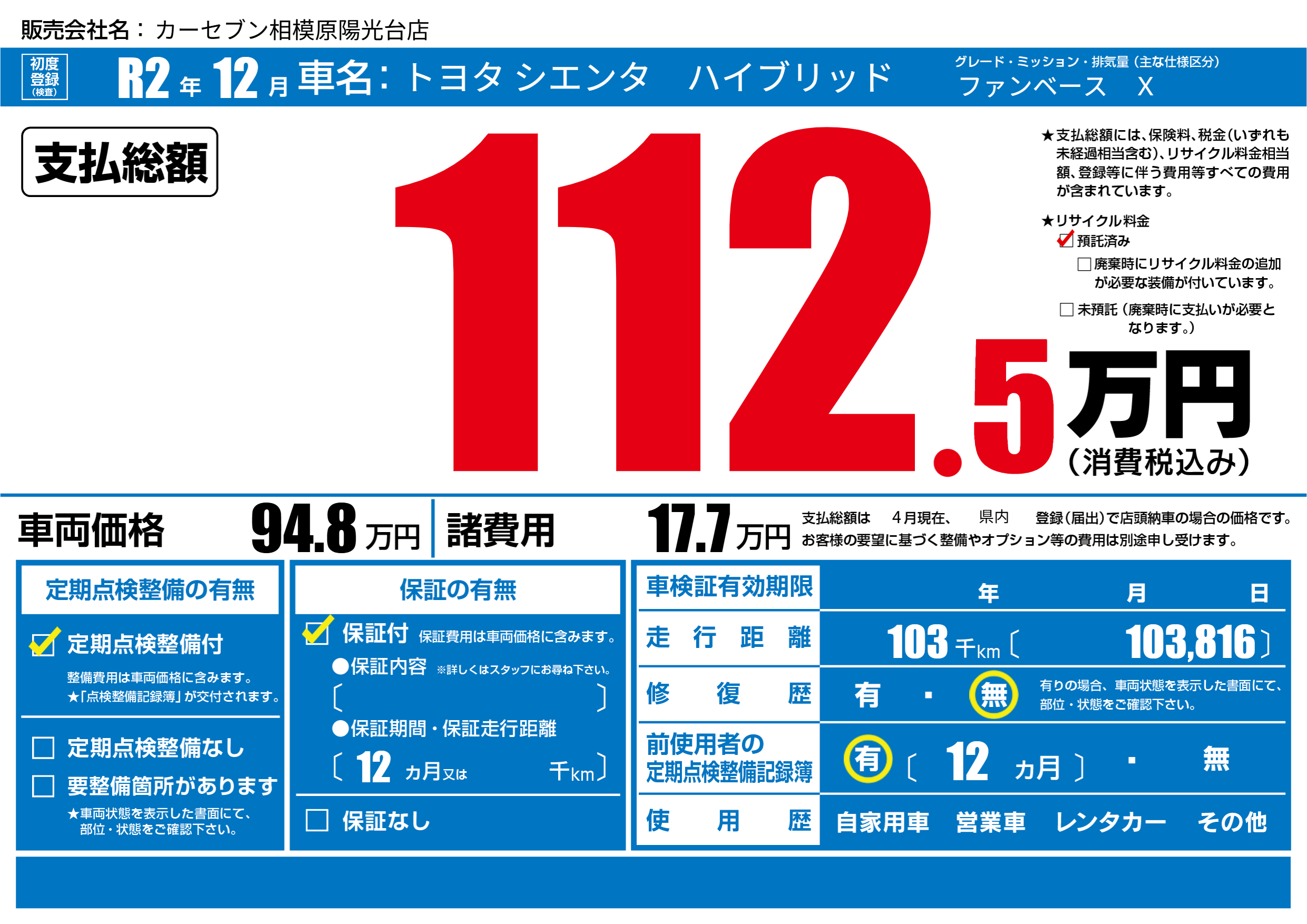 | 車名 | トヨタ シエンタ ハイブリッド | グレード ミッション 排気量 |