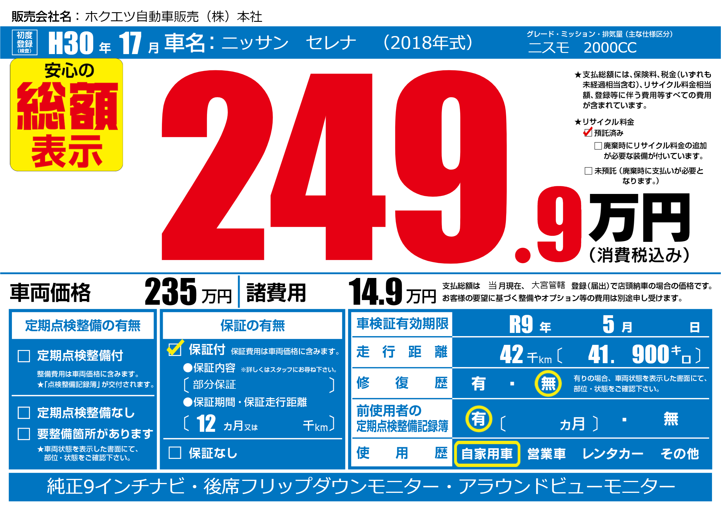 | 車名 | ニッサン セレナ (2018年式) | グレード ミッション 排気量 |