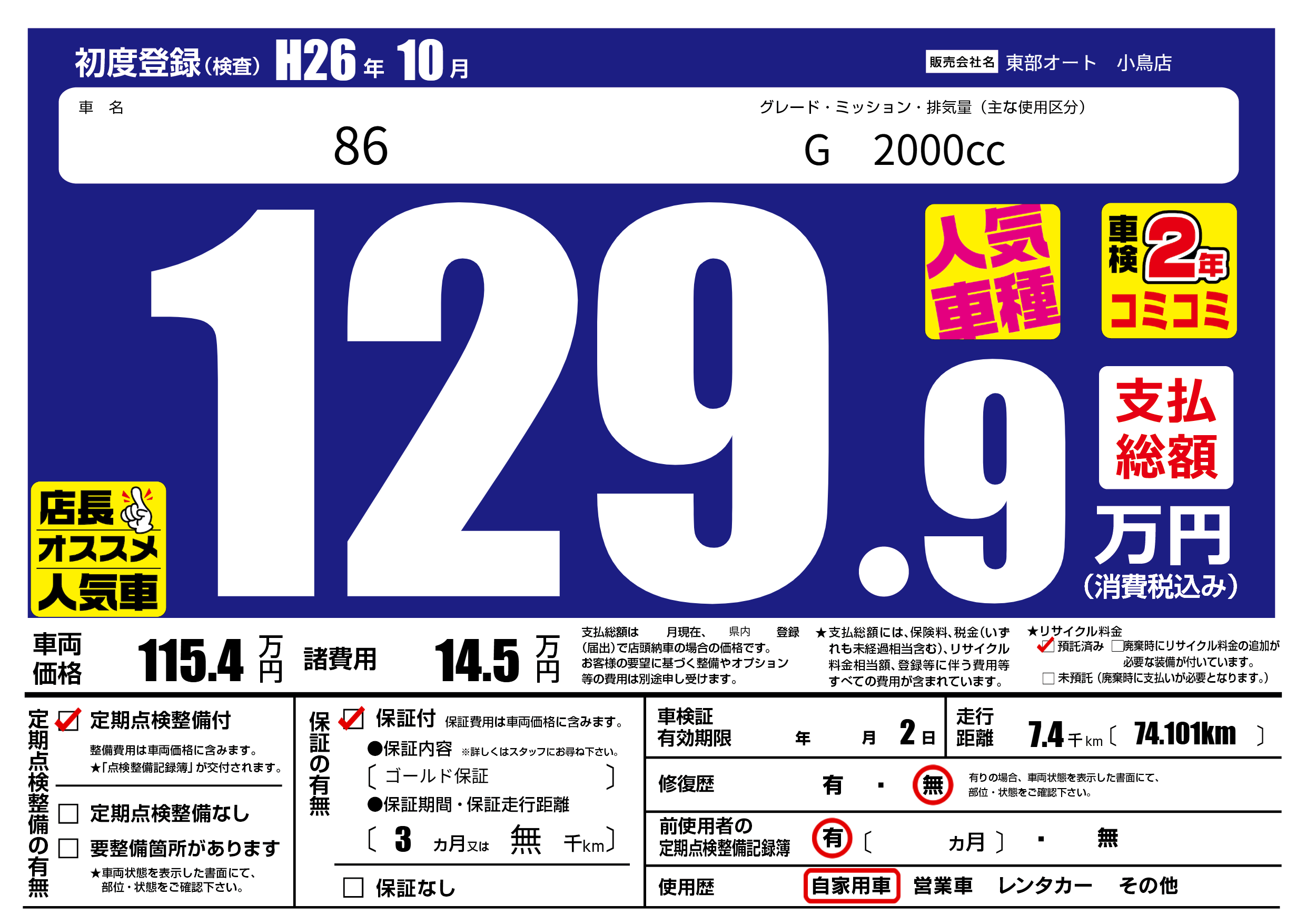 | 走行キロ | 0.7万km | 初年度登録 | H26年10月 |
