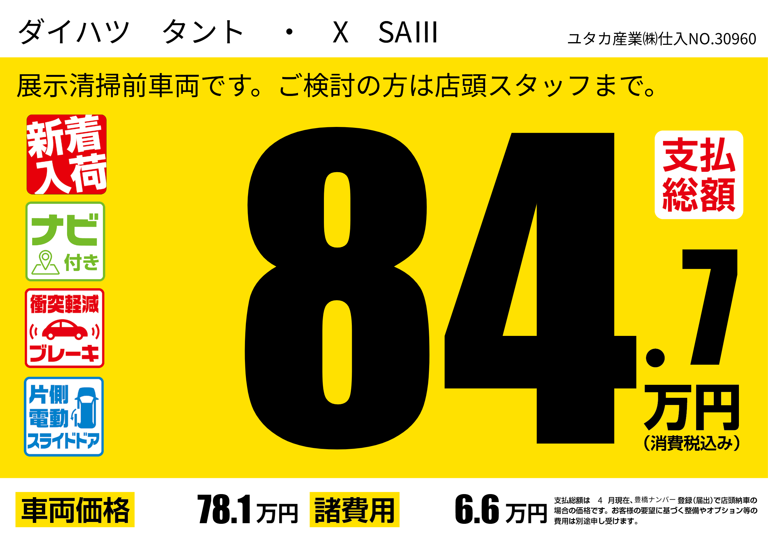 | 車名 | ダイハツ タント ・ X SAⅢ | グレード ミッション 排気量 |