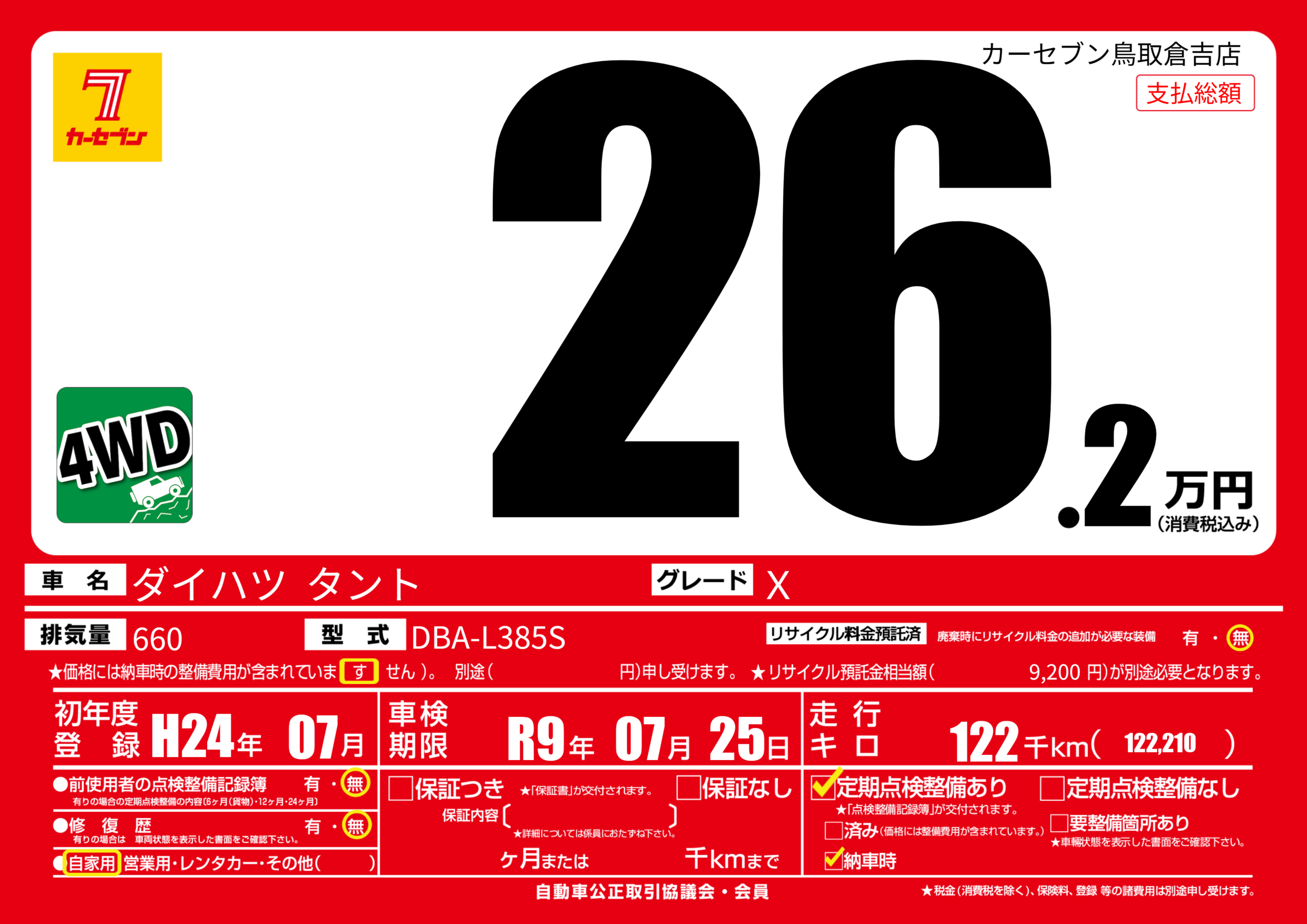 | 車検制限 | R9年 07月 25日 | ||
