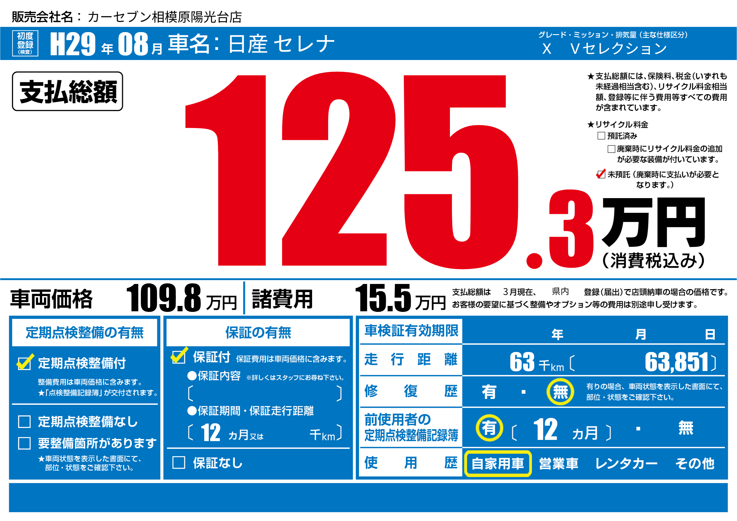 | 車名 | 日産 セレナ | グレード ミッション 排気量 |