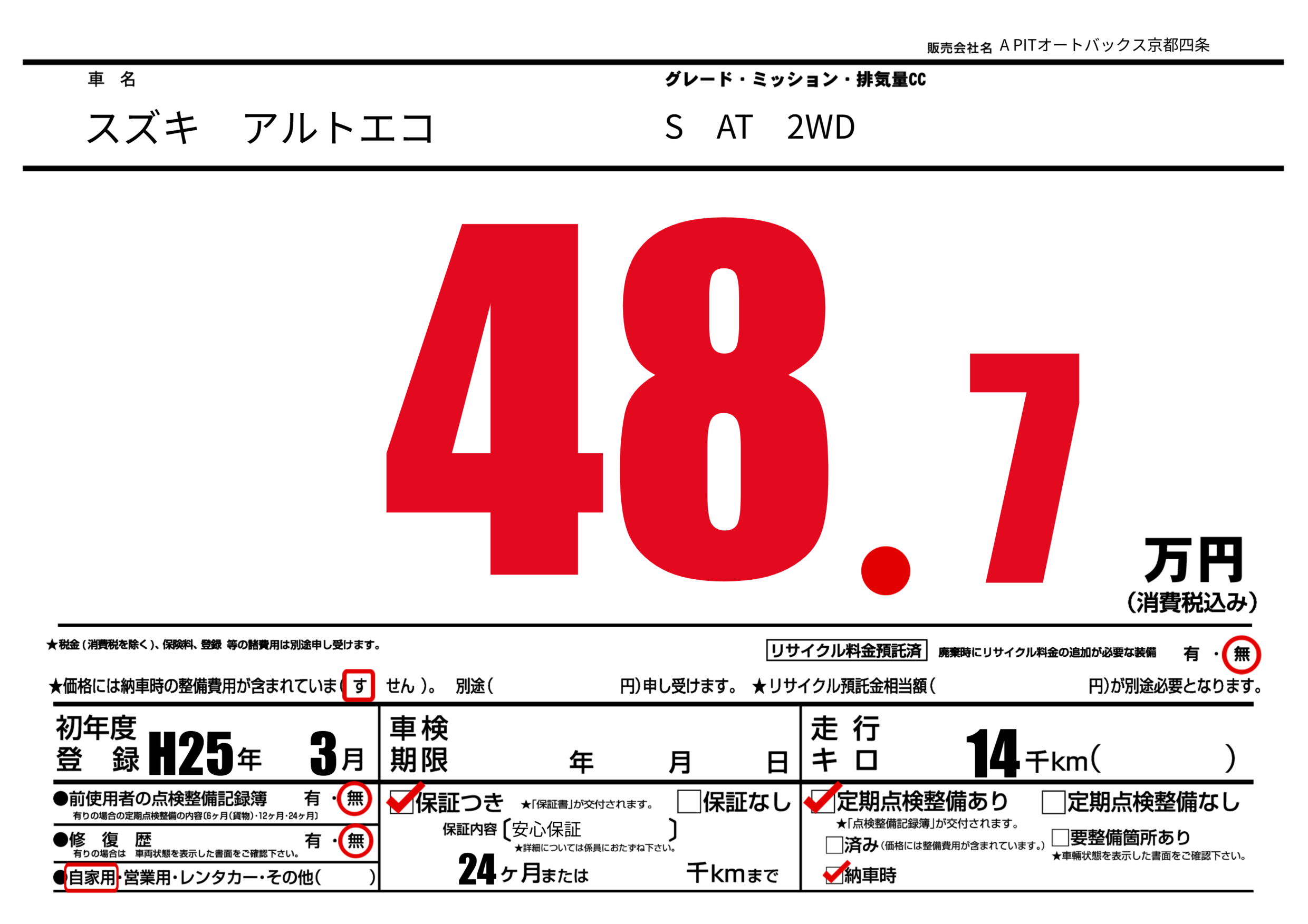 保証なし 保証内容(安心保証) 24ヶ月または()千kmまで |