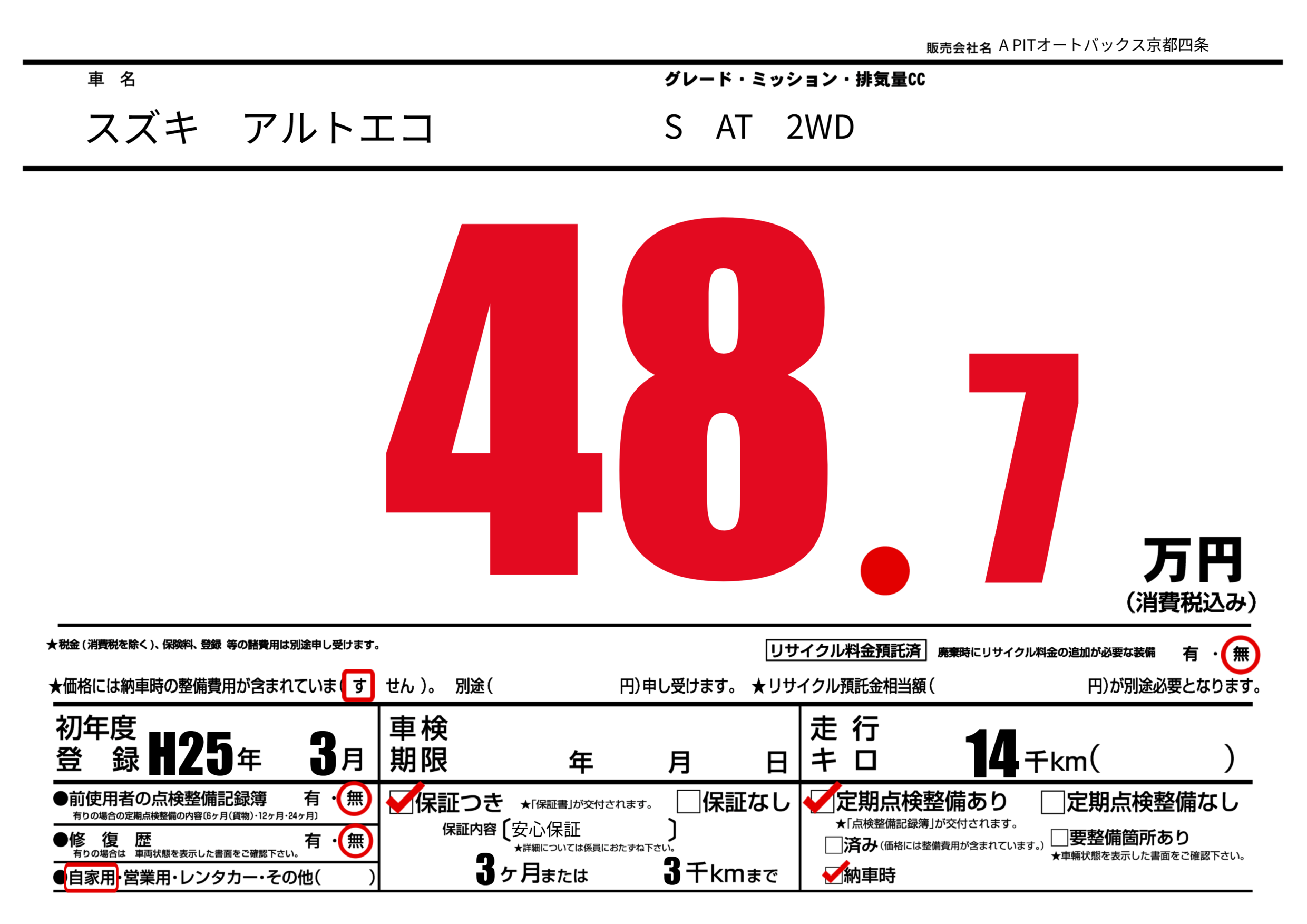 | 車名 | スズキ アルトエコ | グレード ミッション 排気量 |