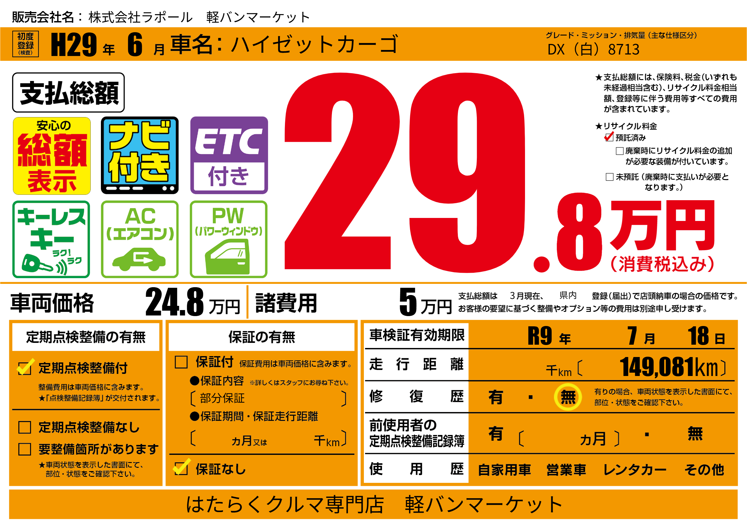 | 車名 | ハイゼットカーゴ | グレード ミッション 排気量 |