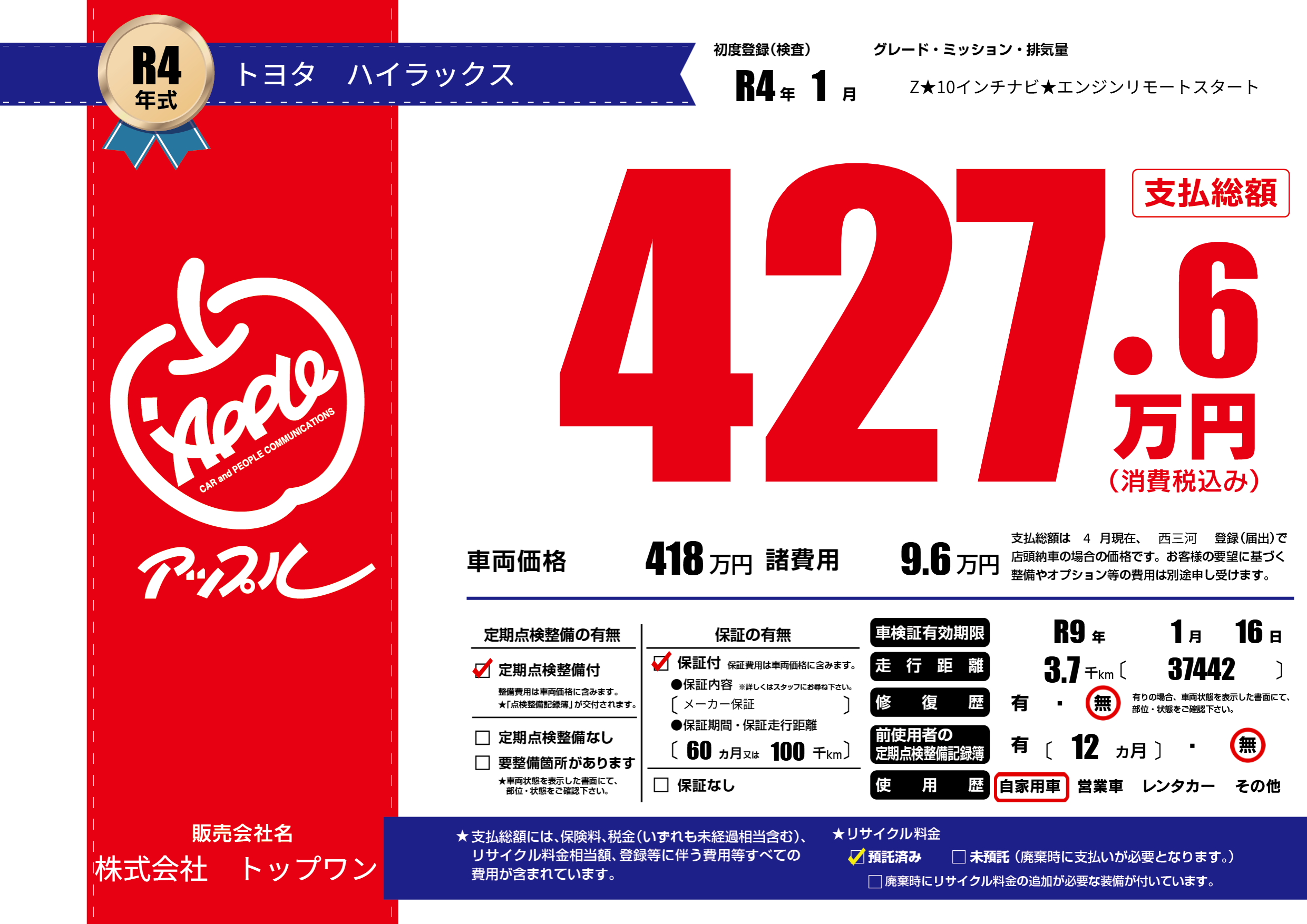 | 走行キロ | 0.3万km | 初年度登録 | R4年1月 |