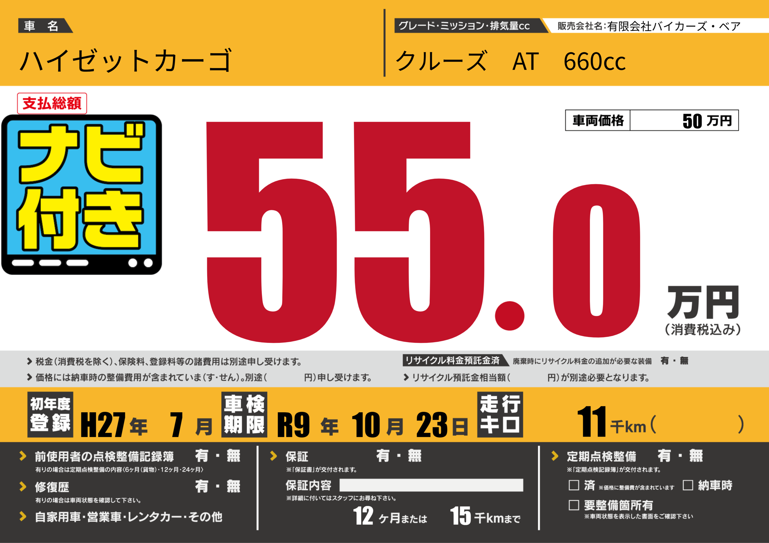 | 車名 | ハイゼットカーゴ | グレード ミッション 排気量 |