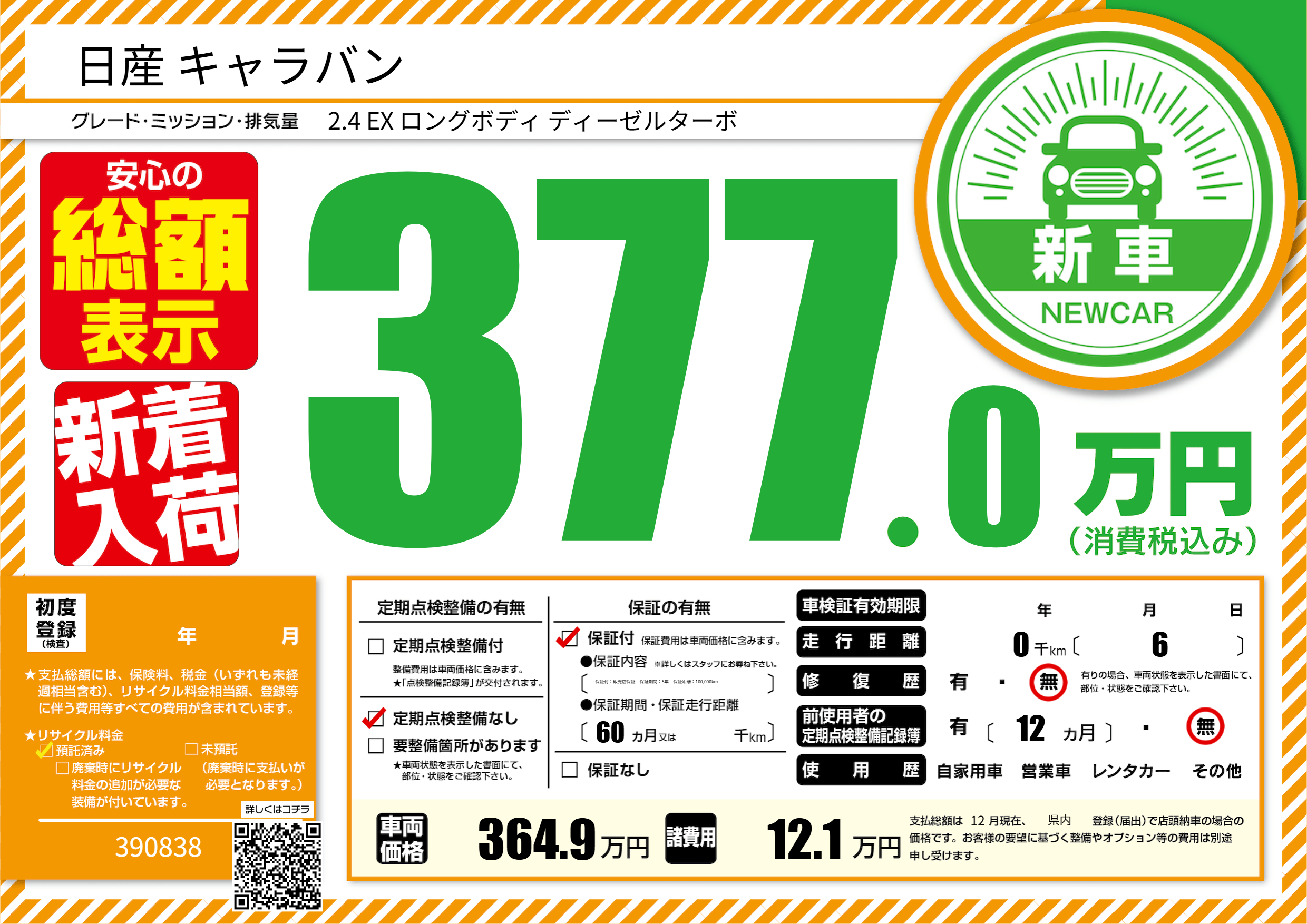 保証なし 保証内容(保証付:販売店保証 保証期間:5年 保証距離:100,000km) 60ヶ月または()千kmまで |