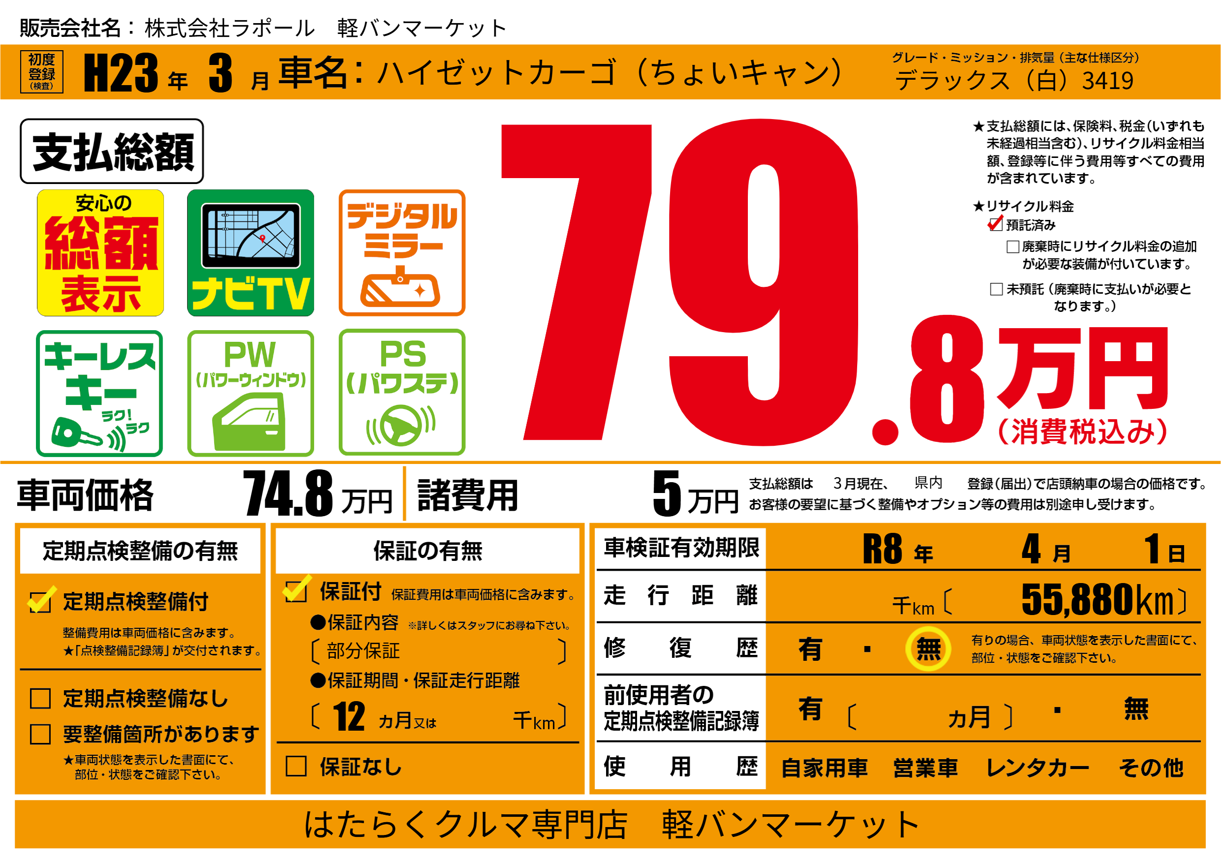 | 車検制限 | R8年 4月 1日 | ||