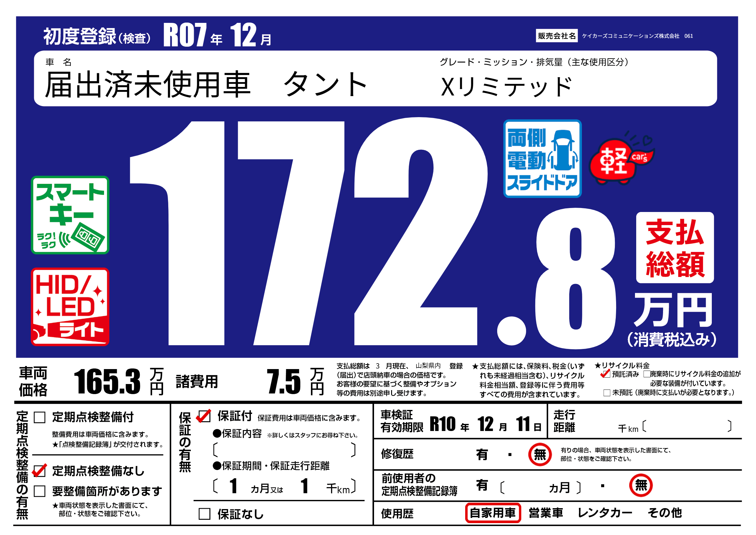 | 走行キロ | - | 初年度登録 | R07年12月 |