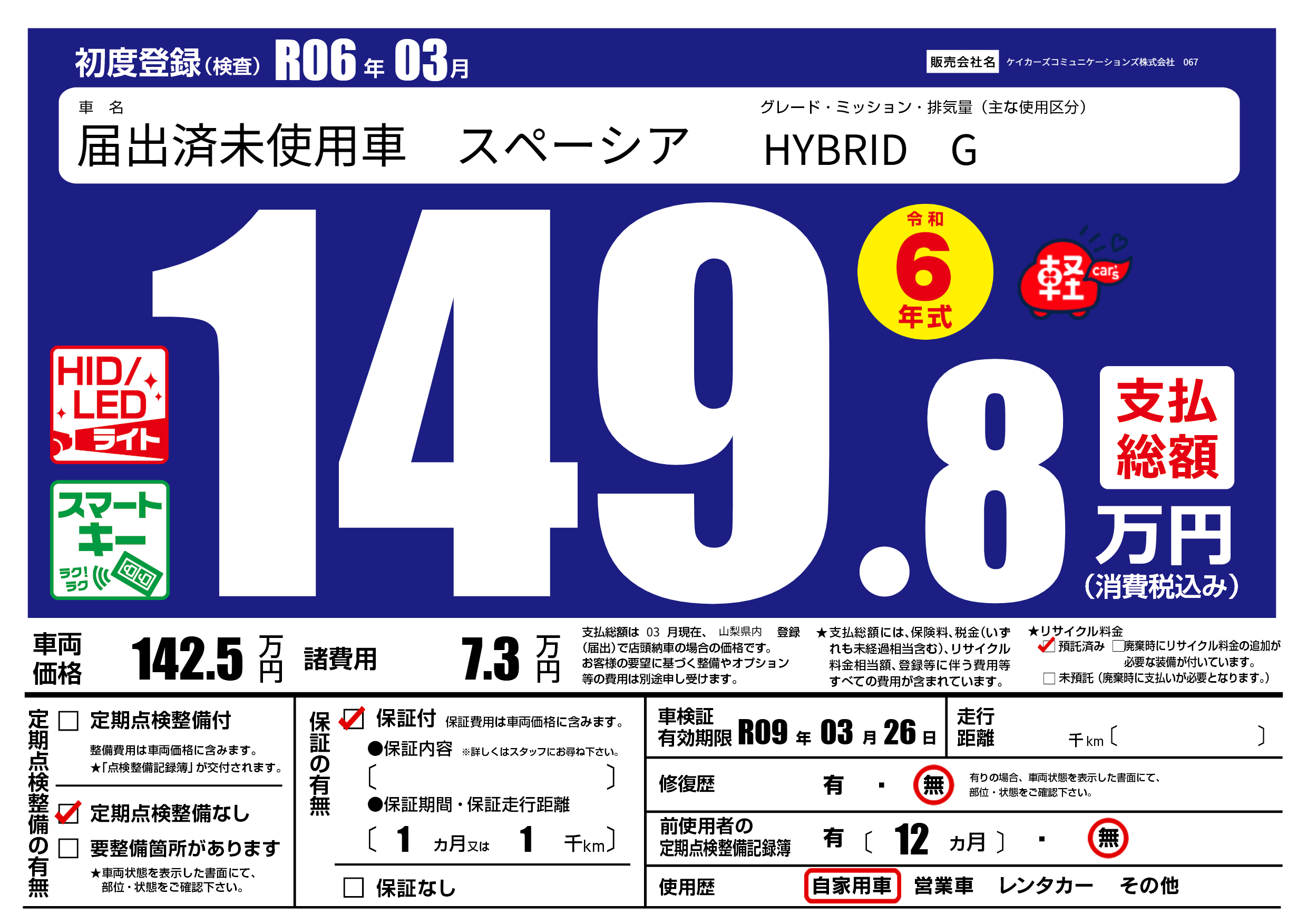 | 走行キロ | - | 初年度登録 | R06年03月 |