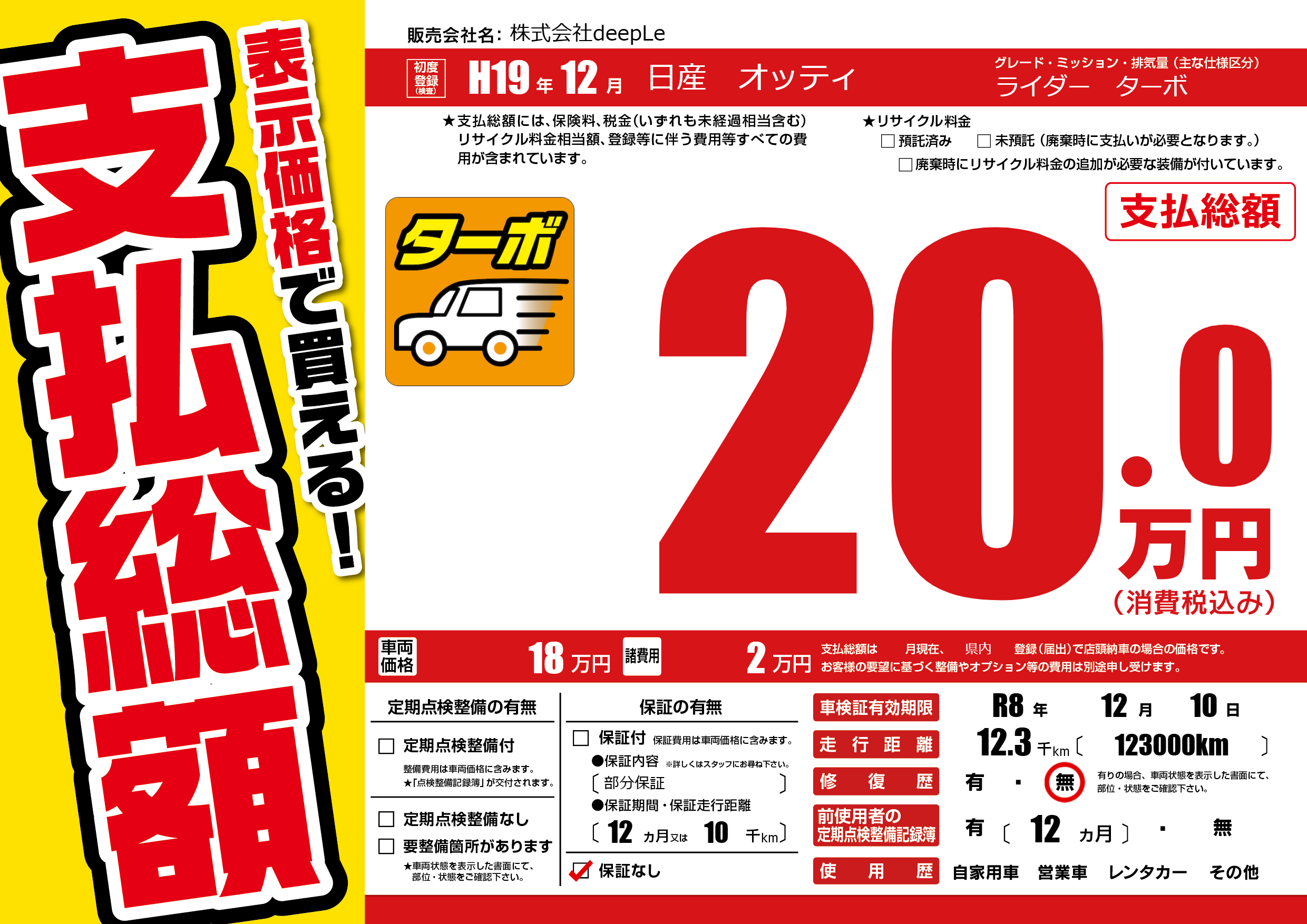 | 車名 | 日産 オッティ | グレード ミッション 排気量 |