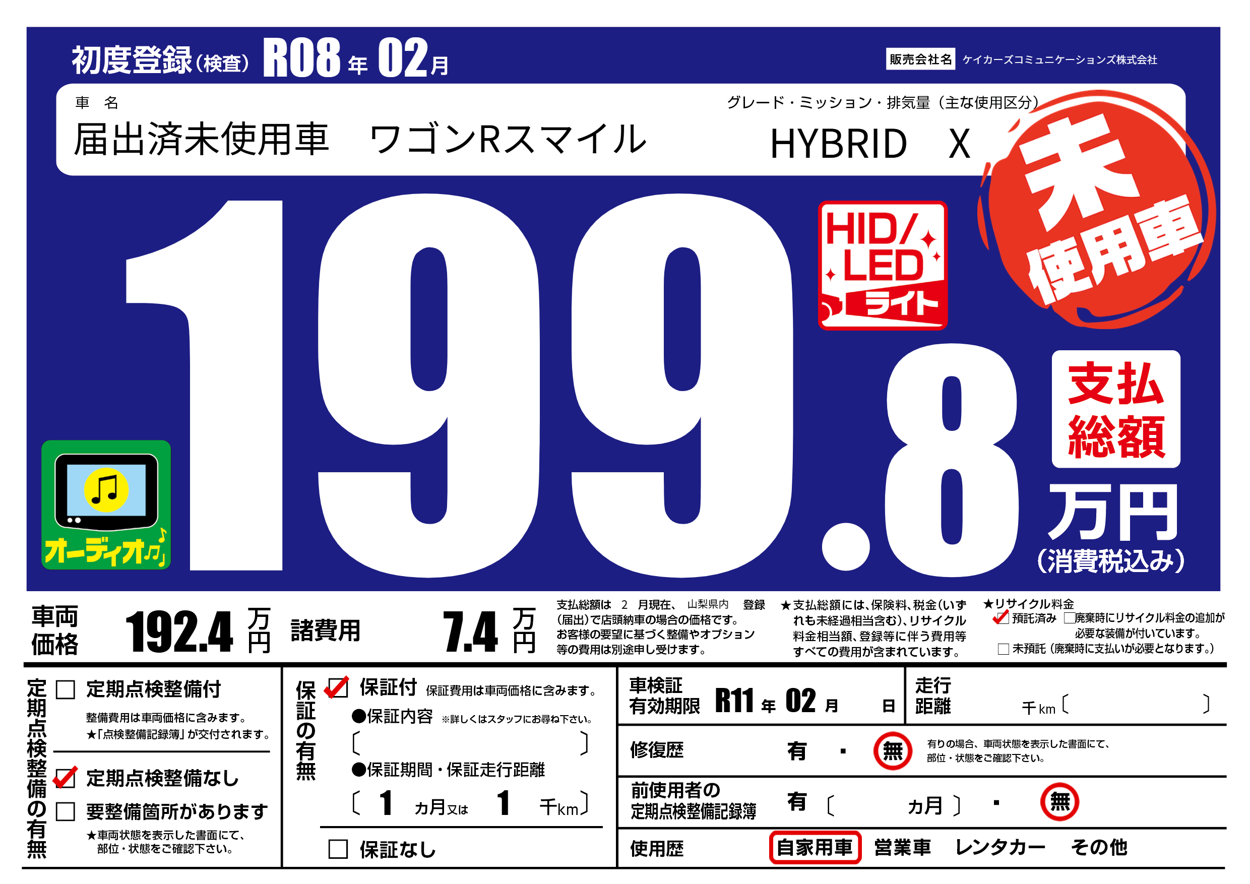 | 車名 | 届出済未使用車 ワゴンRスマイル | グレード ミッション 排気量 |