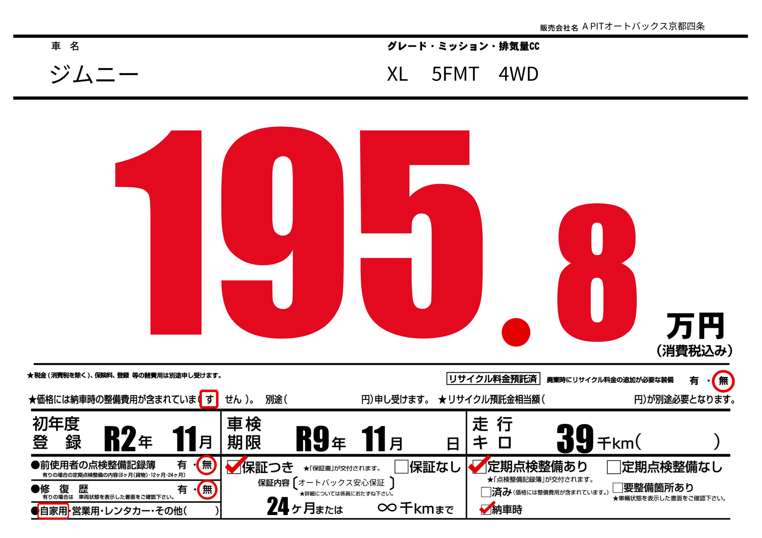 | 車検制限 | R9年 11月 - 日 | ||