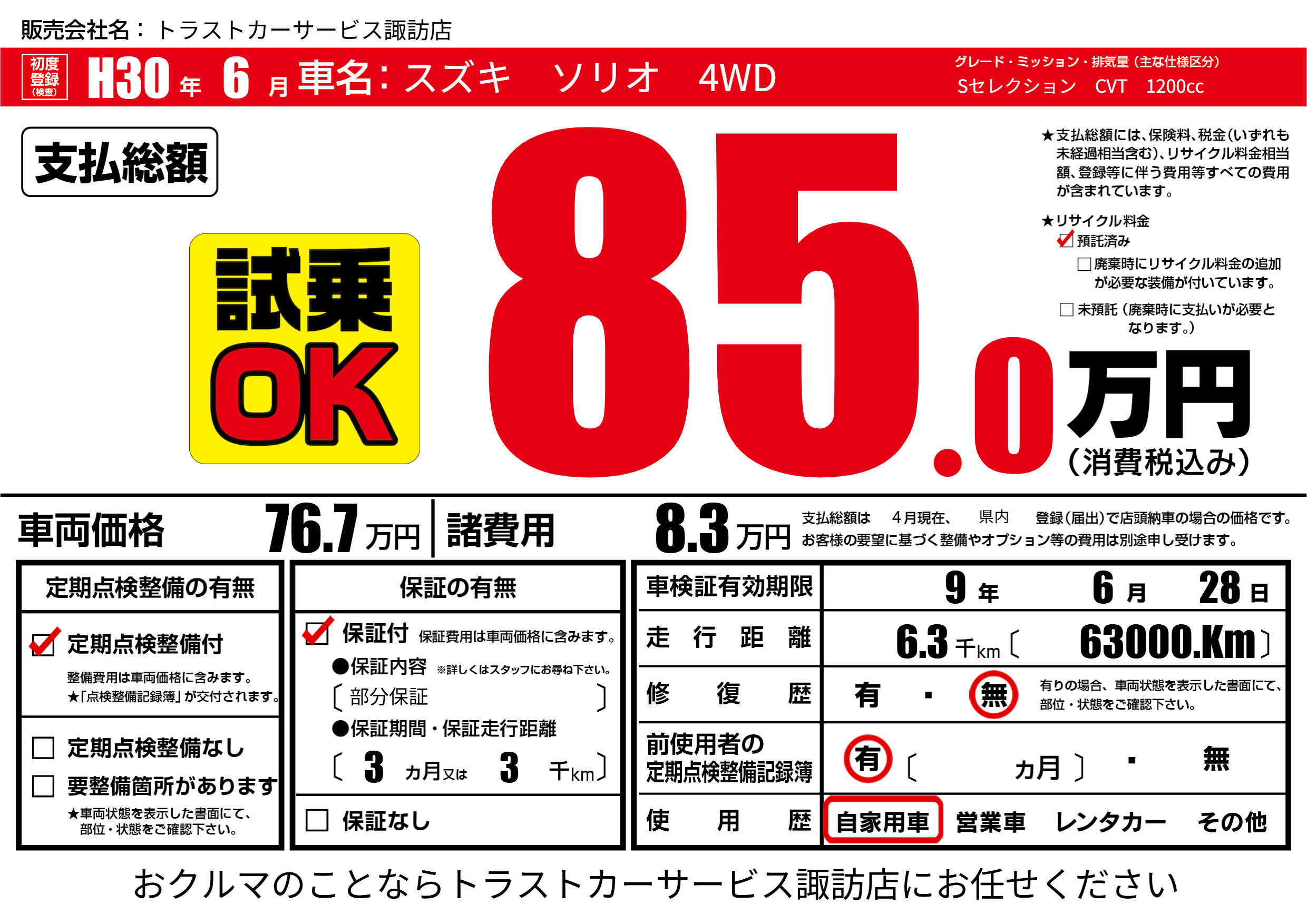 | 車名 | スズキ ソリオ 4WD | グレード ミッション 排気量 |