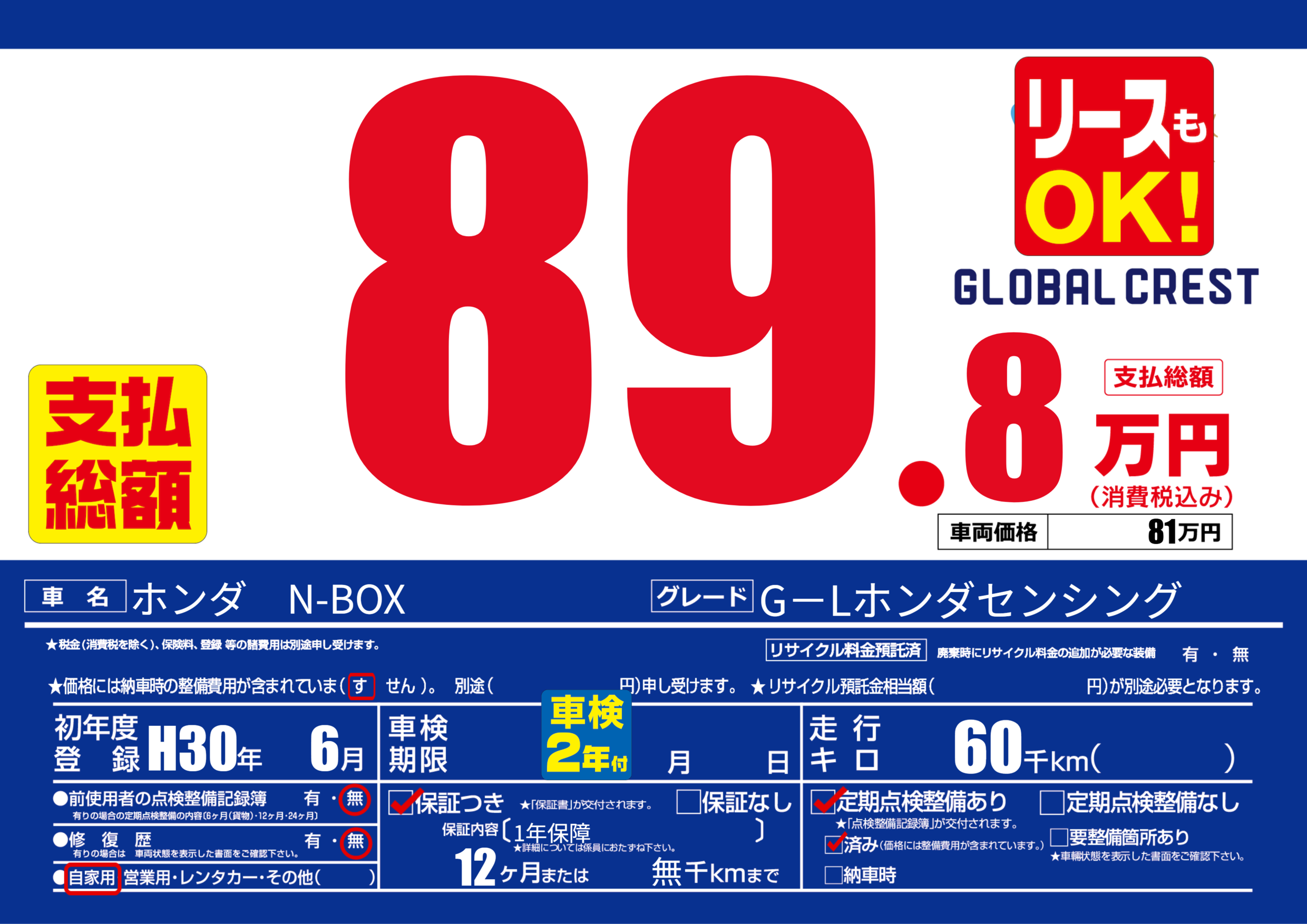 | 走行キロ | 6万km | 初年度登録 | H30年6月 |