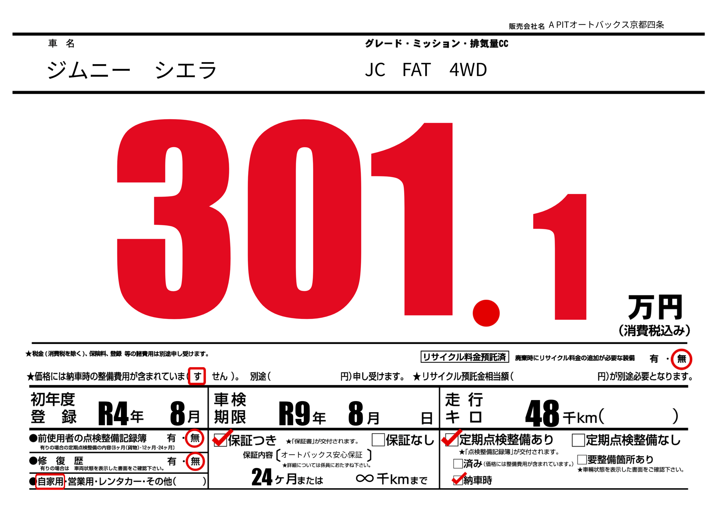 | 車検制限 | R9年 8月 - 日 | ||