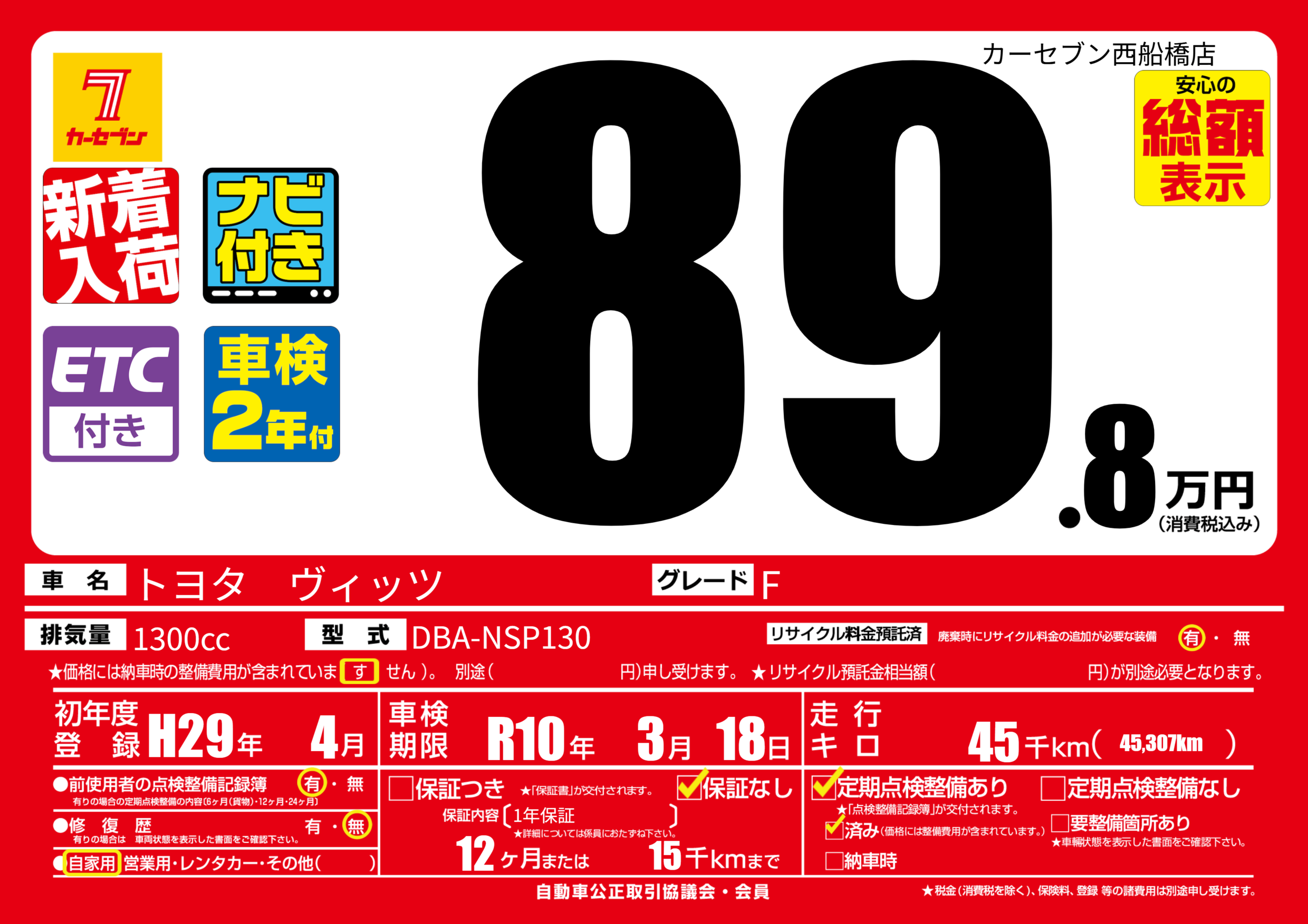 | 定期点検整備 | 定期点検整備あり 定期点検整備済み | ||