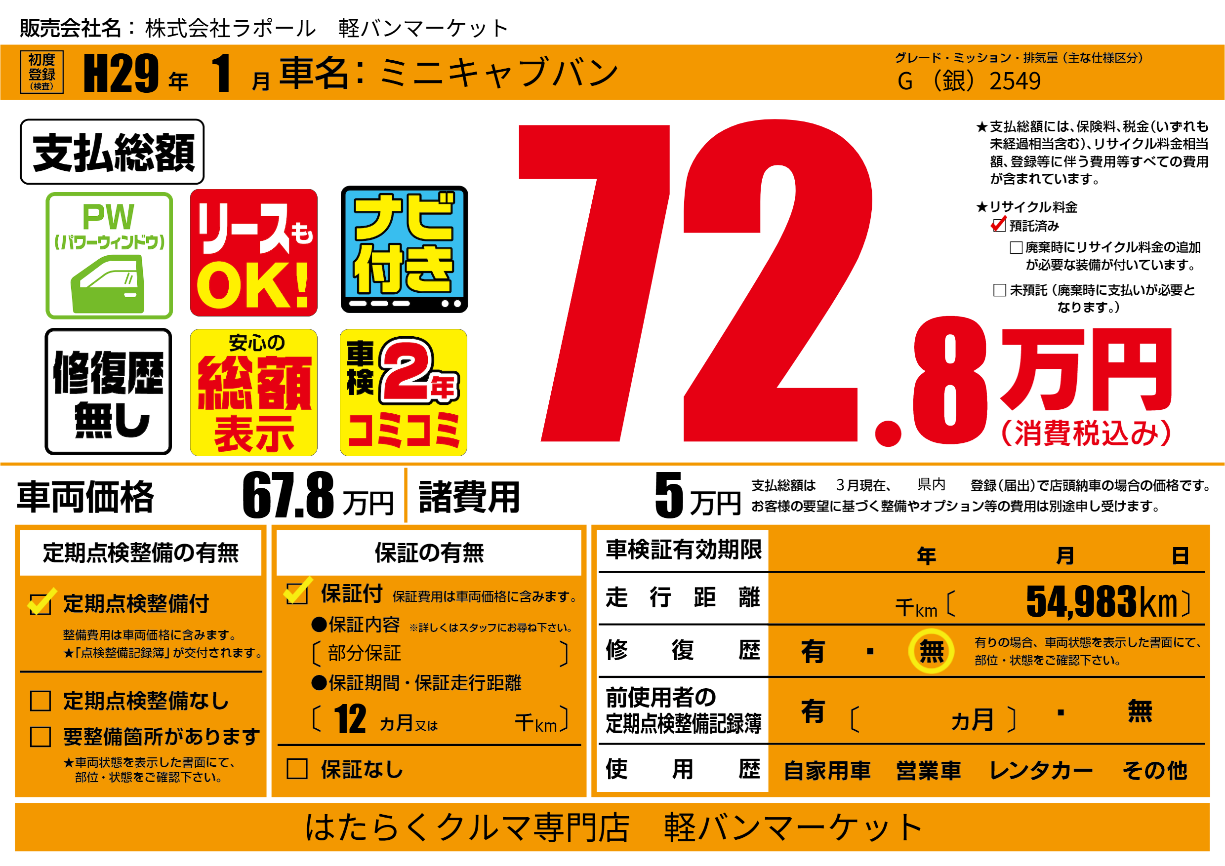 保証付き 保証内容(部分保証) 12ヶ月または()千kmまで |