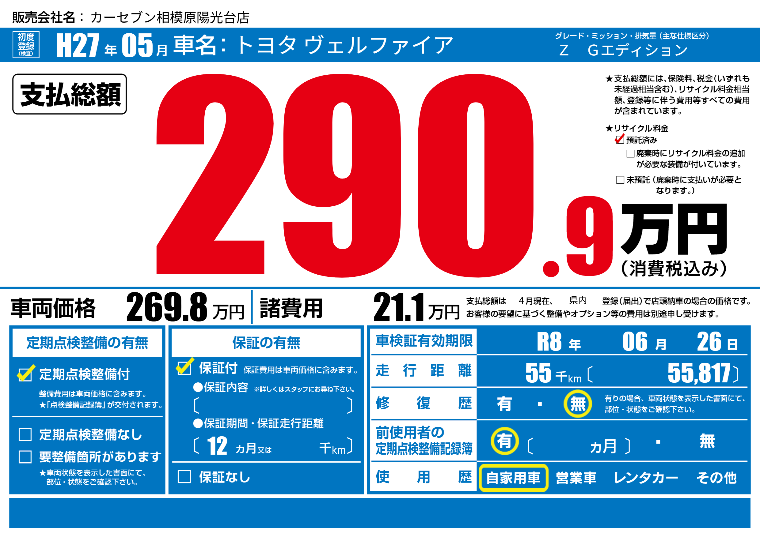 | 車名 | トヨタ ヴェルファイア | グレード ミッション 排気量 |