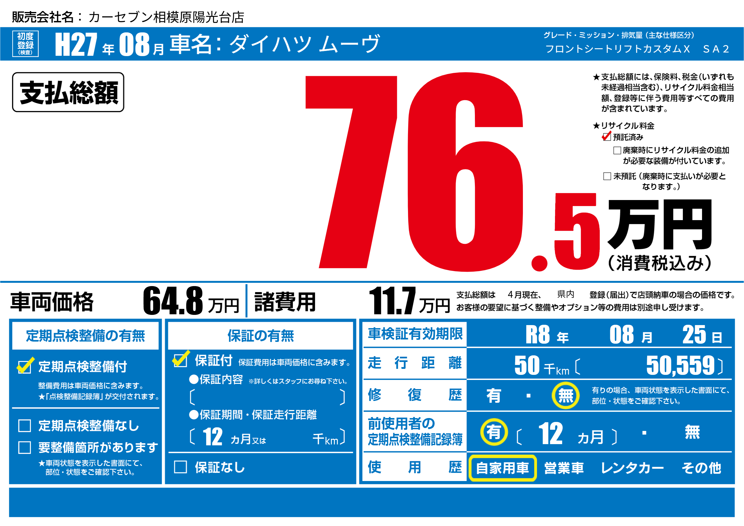 なし | 車検制限 | R8年08月25月 |