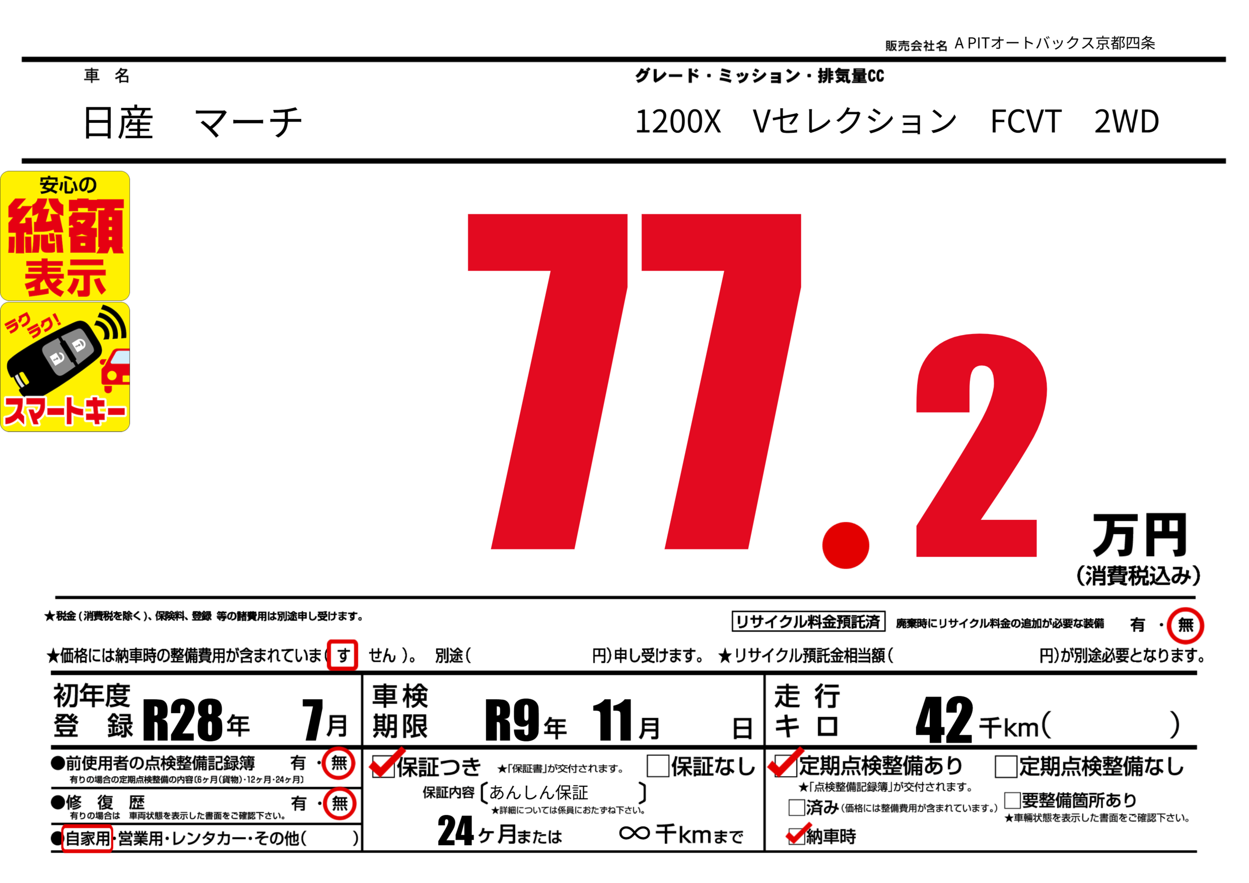 保証なし 保証内容(あんしん保証) 24ヶ月または(∞)千kmまで |
