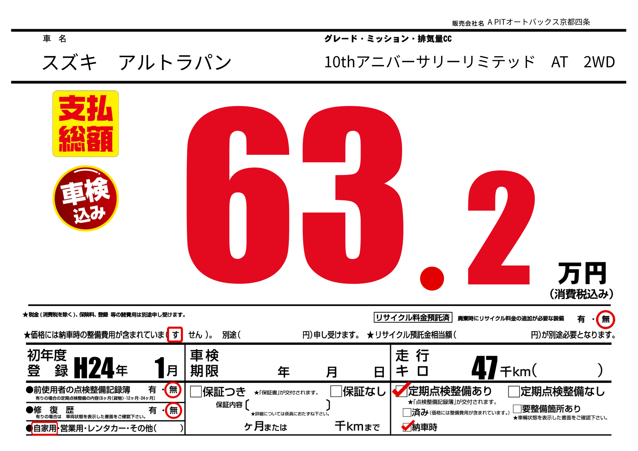 | 定期点検整備 | 定期点検整備あり 納車時あり | ||