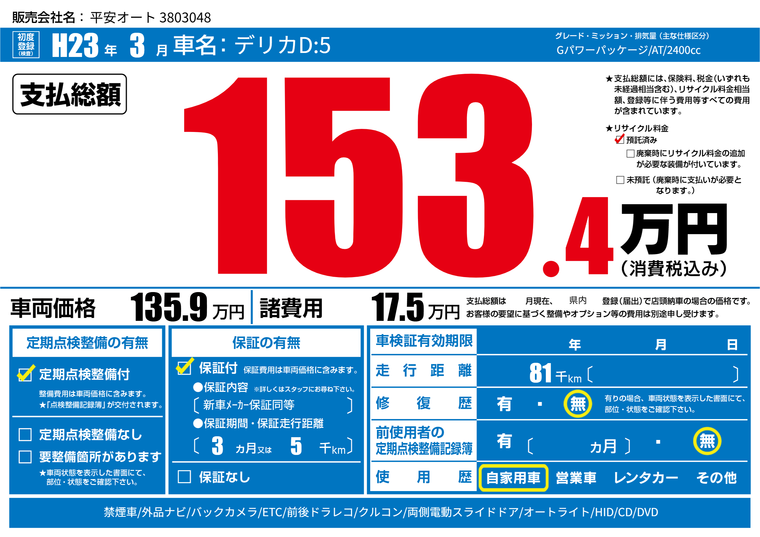 | 走行キロ | 8.1万km | 初年度登録 | H23年3月 |