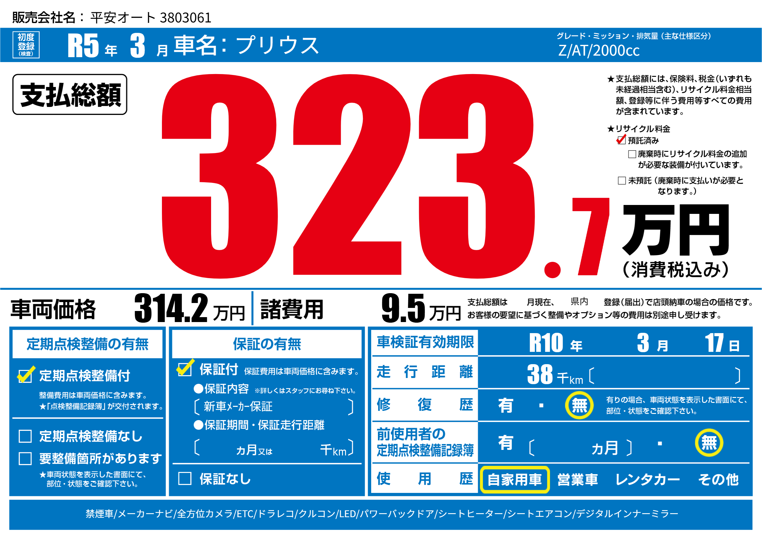 | 車名 | プリウス | グレード ミッション 排気量 |
