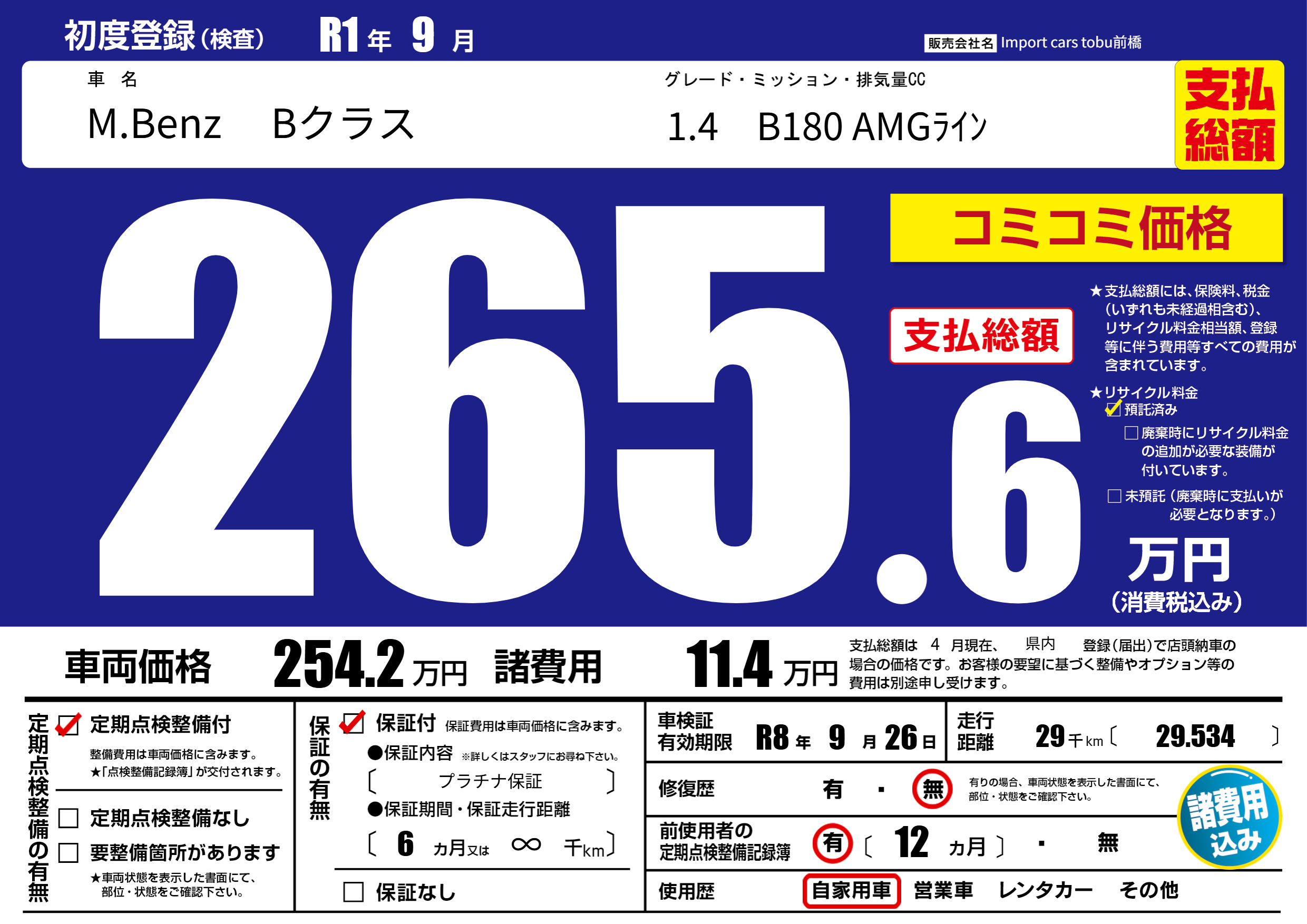 | 車名 | M.Benz Bクラス | グレード ミッション 排気量 |