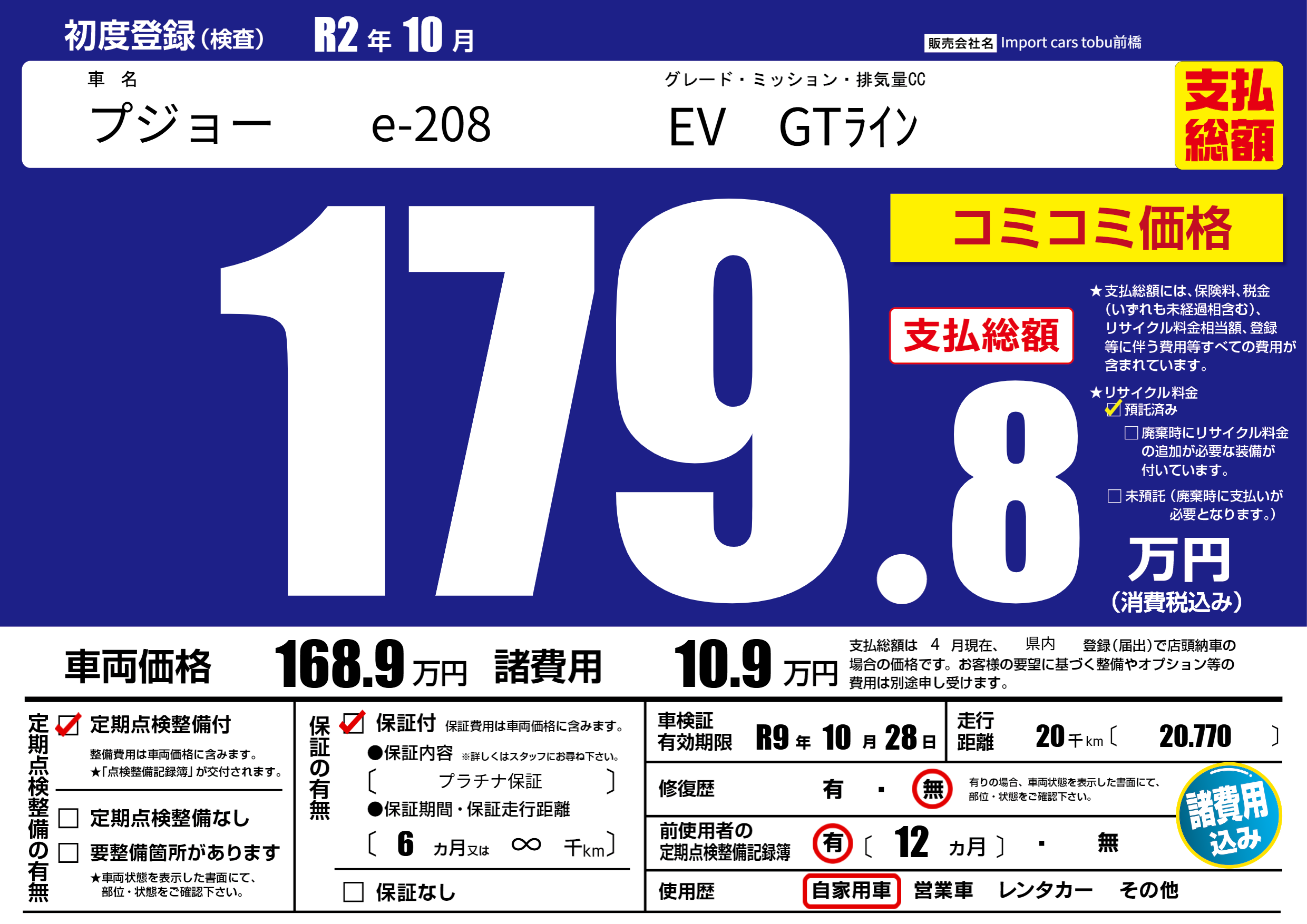 | 車名 | プジョー e-208 | グレード ミッション 排気量 |