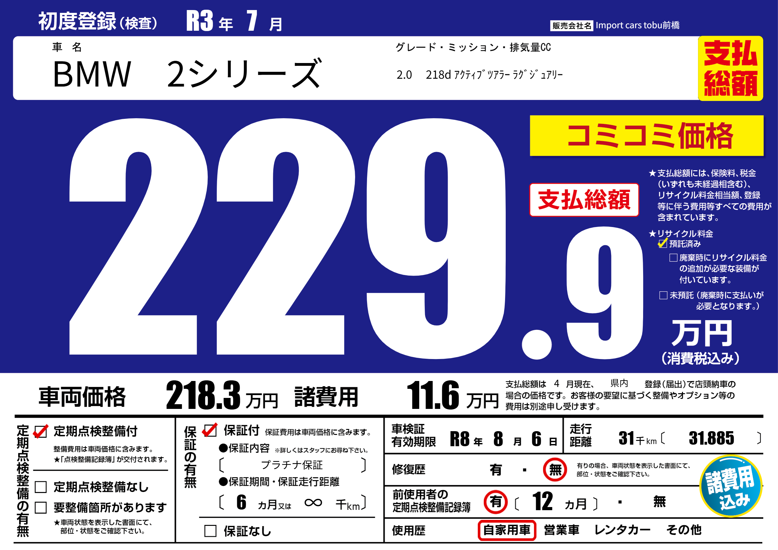 保証付き 保証内容( プラチナ保証) 6ヶ月または(∞)千kmまで |