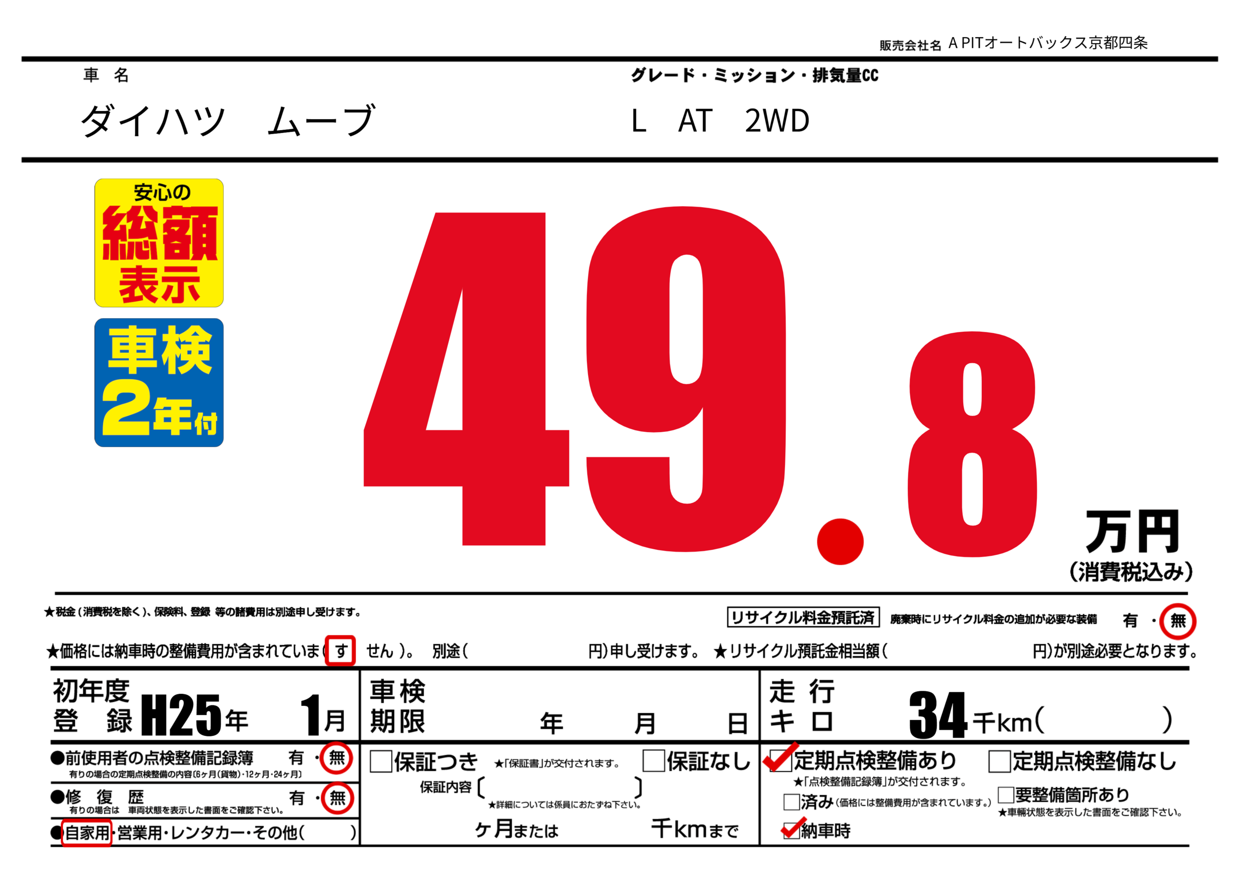 | 定期点検整備 | 定期点検整備あり 納車時あり | ||