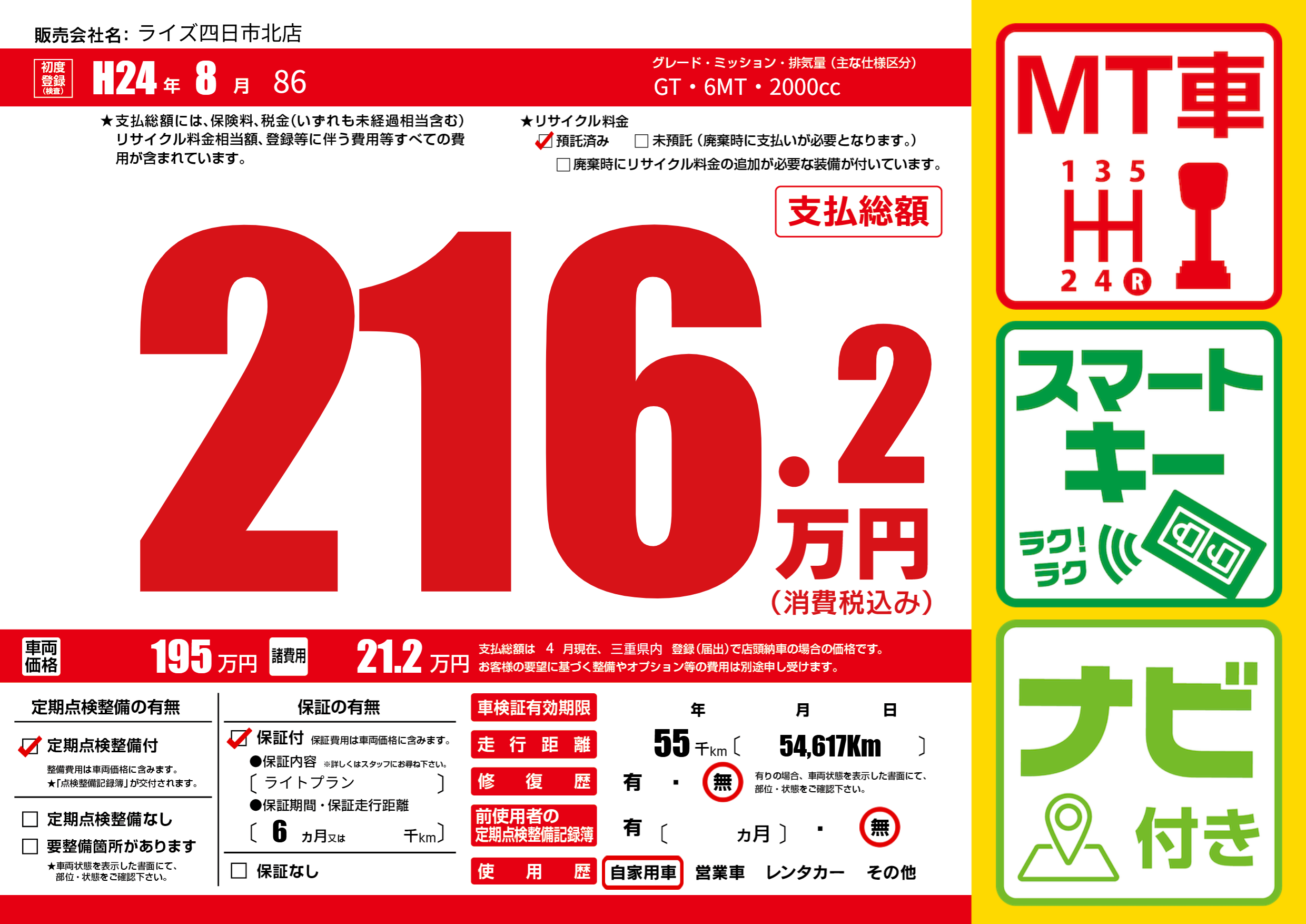 | 走行キロ | 5.5万km | 初年度登録 | H24年8月 |