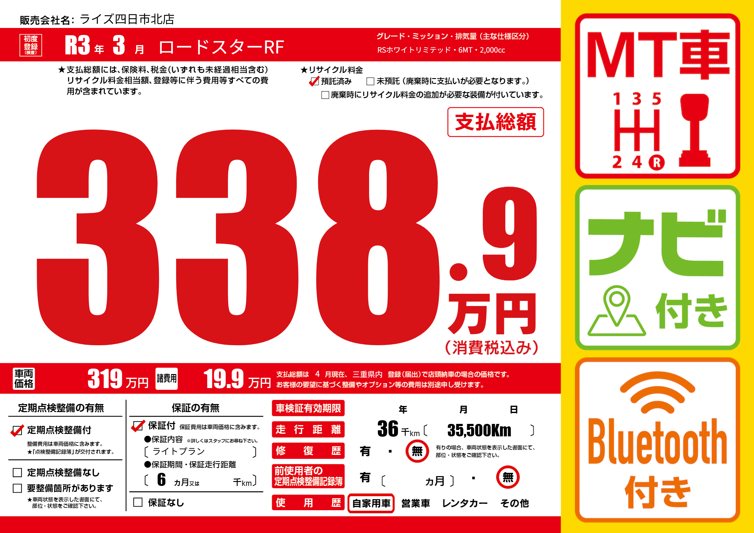 | 車名 | ロードスターRF | グレード ミッション 排気量 |