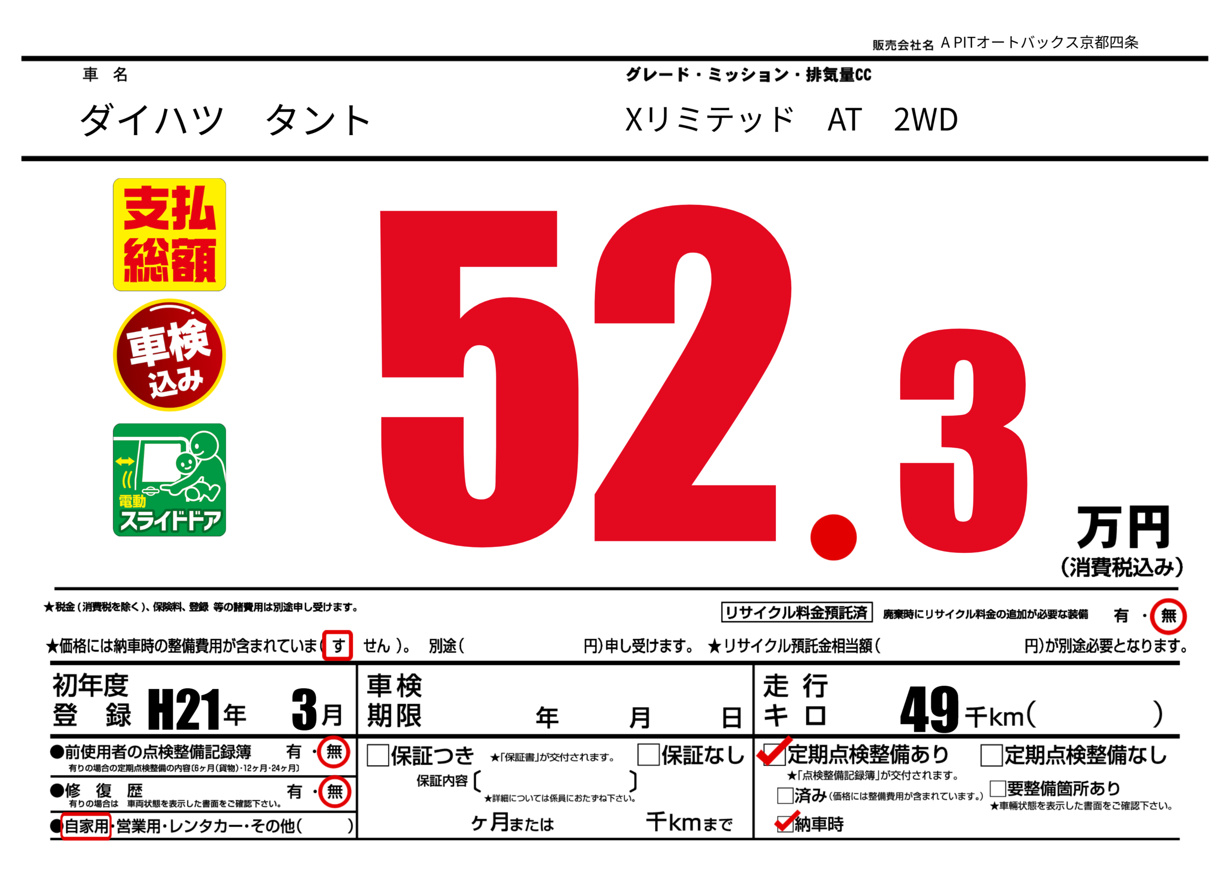 | 定期点検整備 | 定期点検整備あり 納車時あり | ||