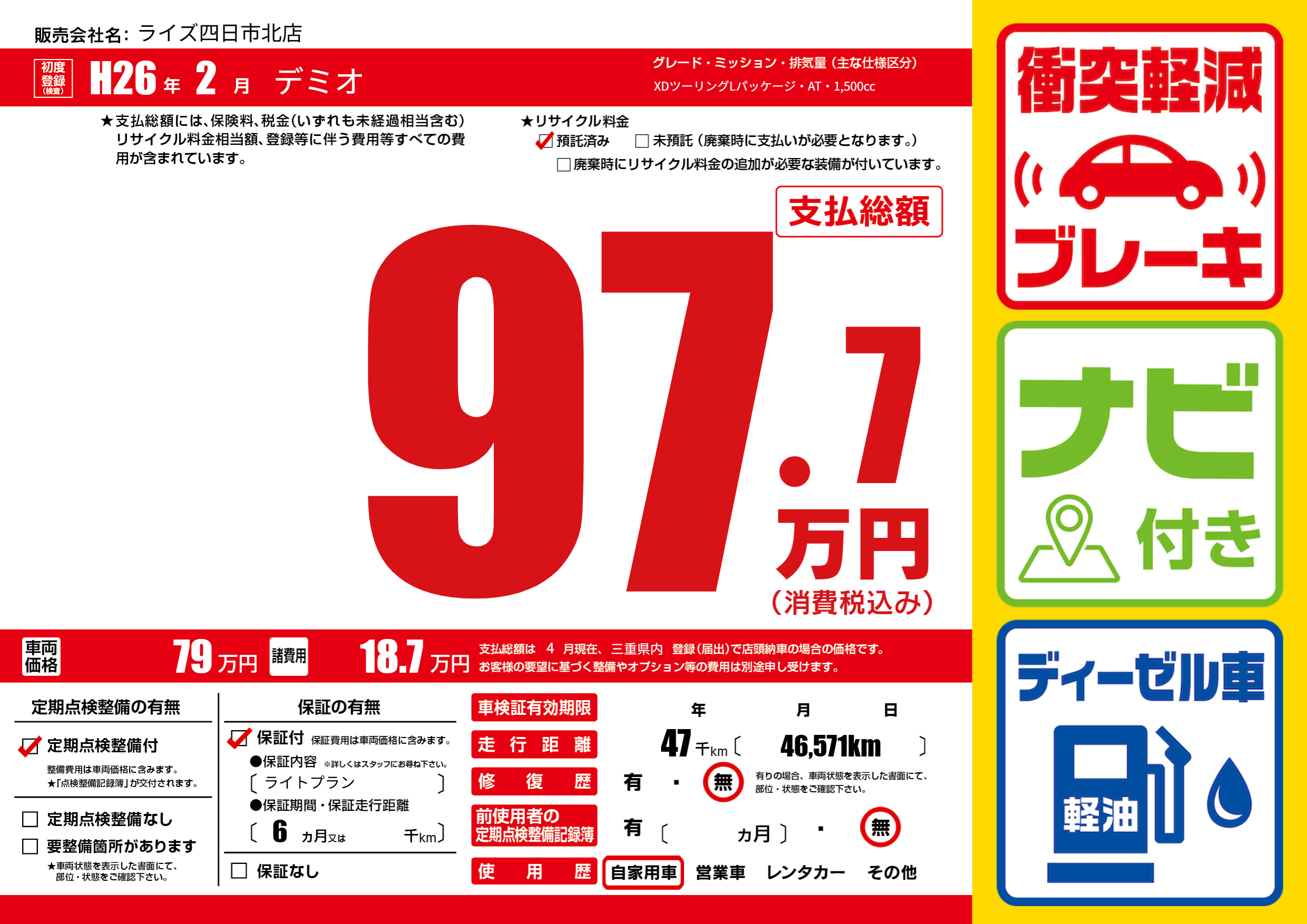 | 車名 | デミオ | グレード ミッション 排気量 |