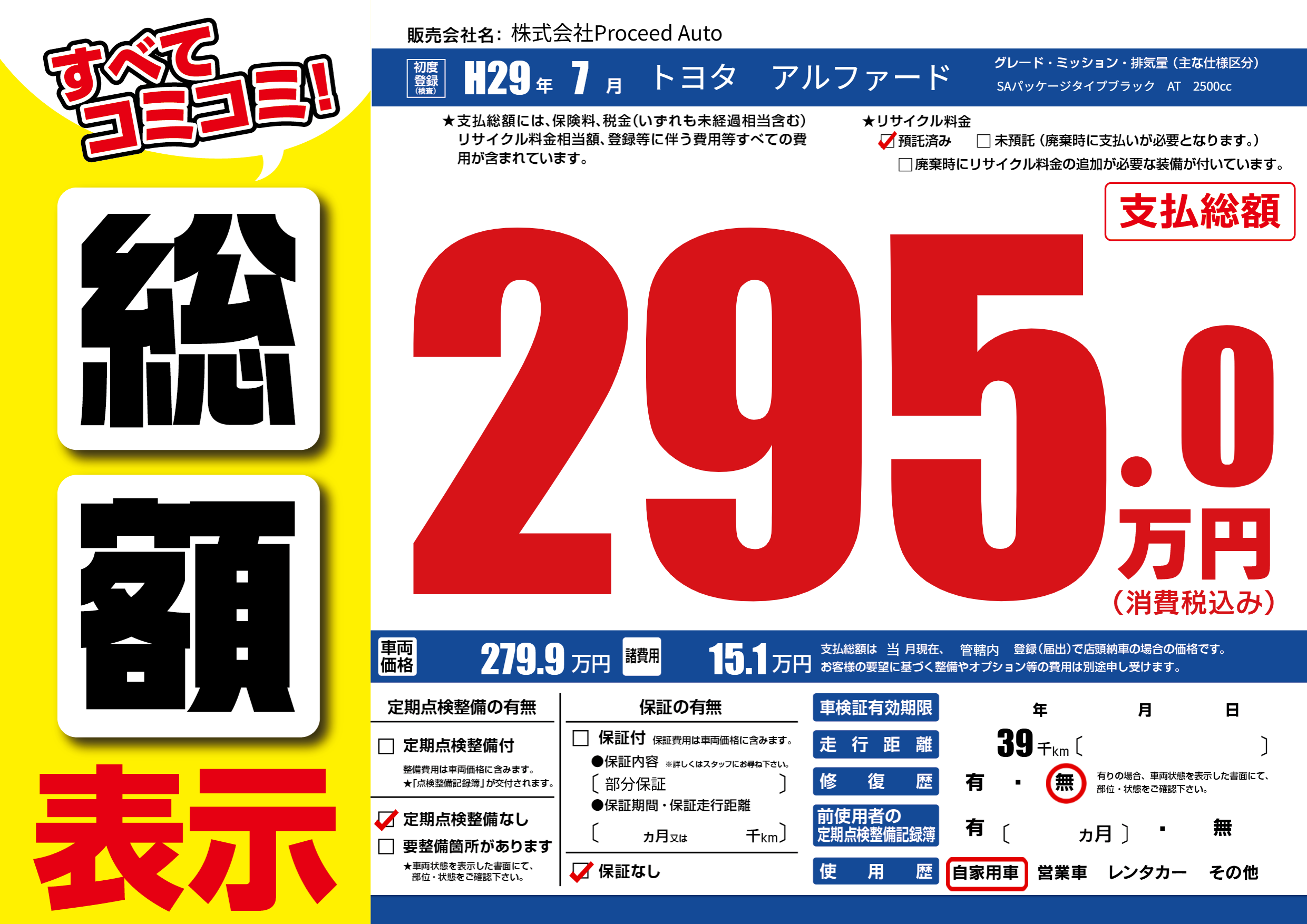 | 車名 | トヨタ アルファード | グレード ミッション 排気量 |