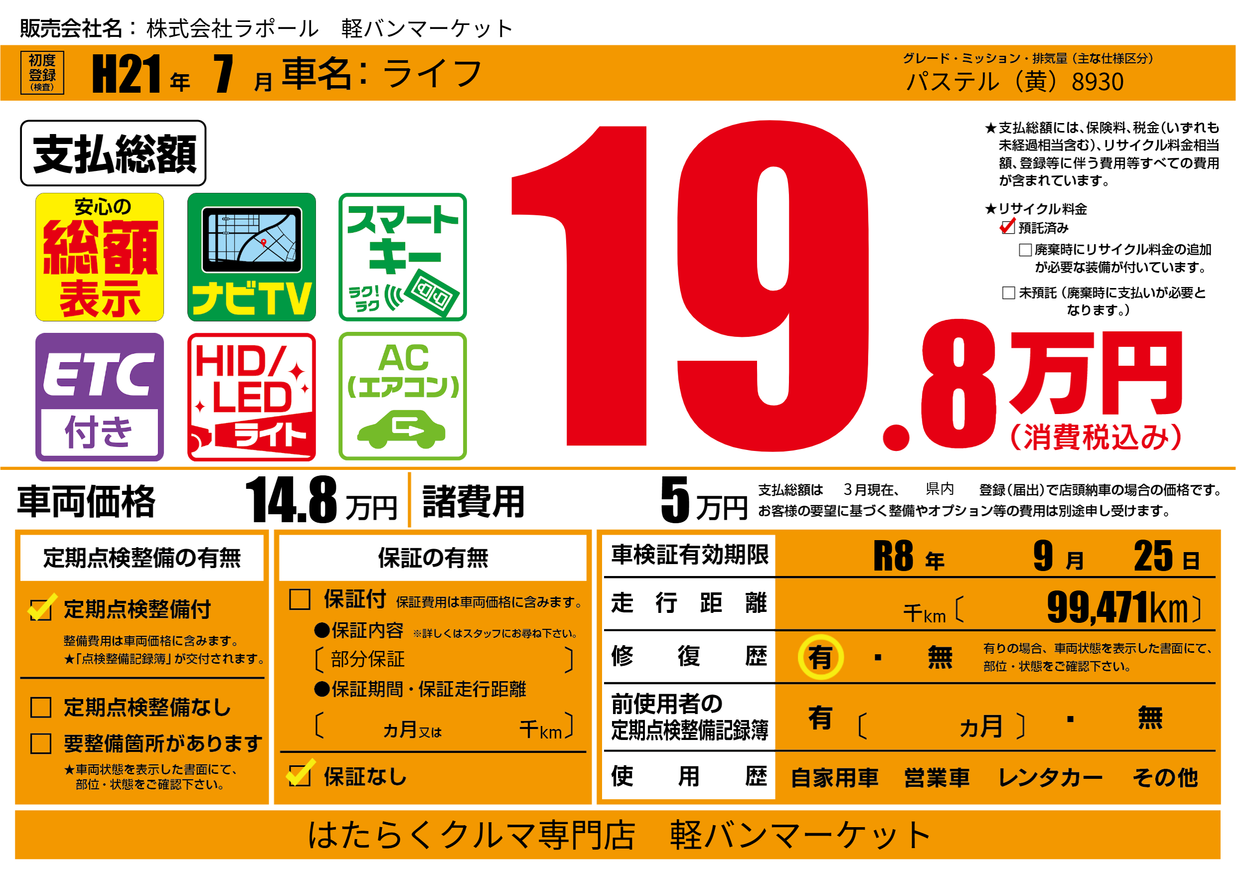 | 車名 | ライフ | グレード ミッション 排気量 |